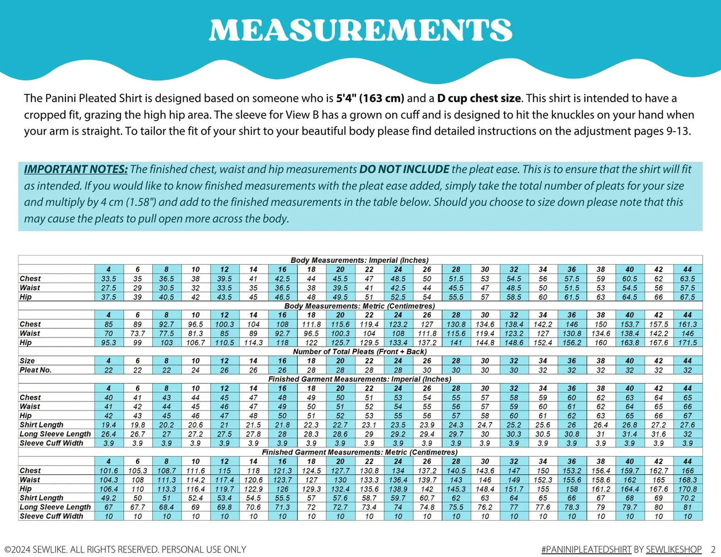 Size inclusive pdf sewing pattern with sizes 2-44.