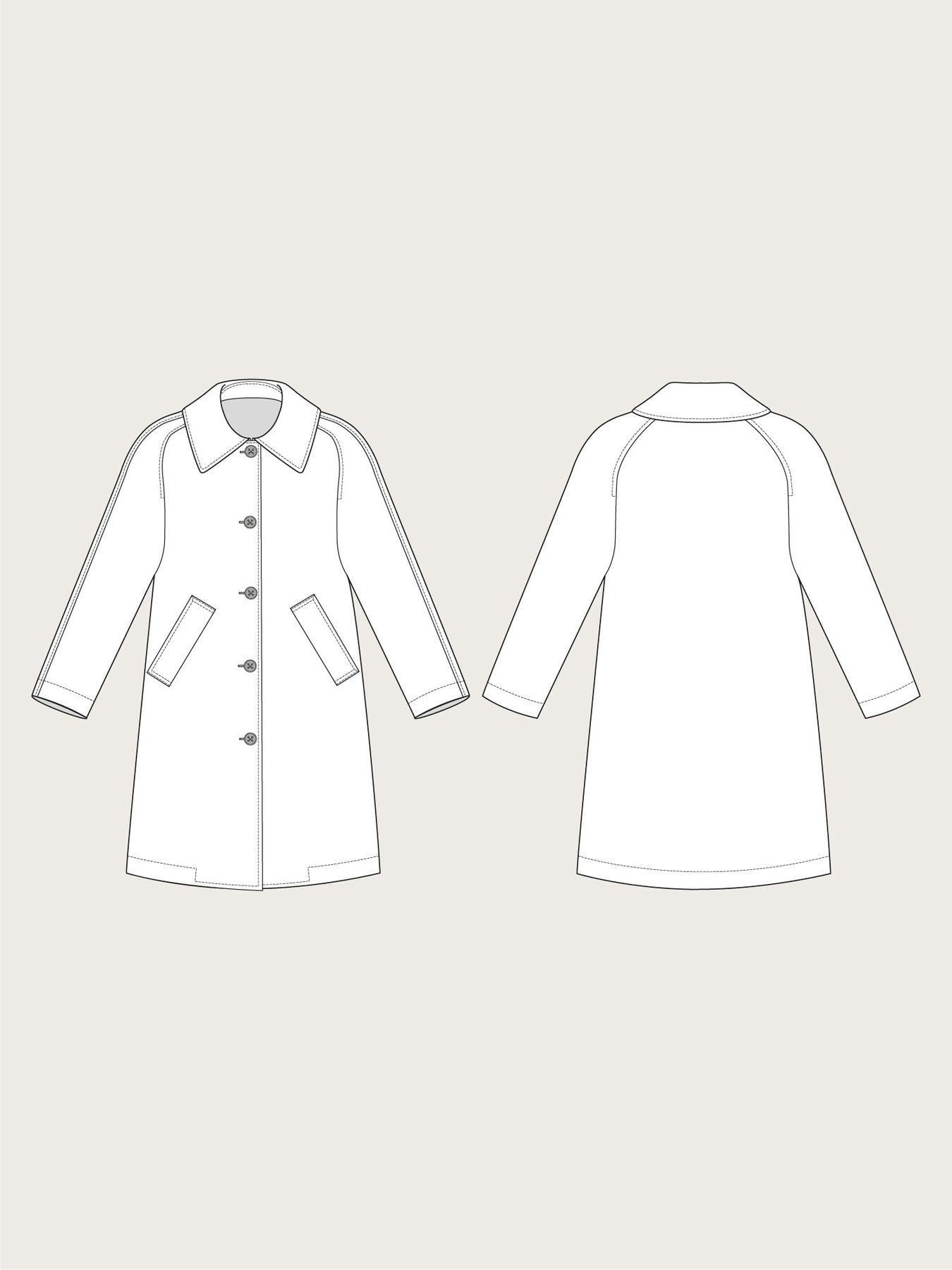 The classic car coat constructed for a modern wardrobe. It is slightly a-lined with a relaxed fit, features raglan sleeves and front welt pockets. Can be sewn with or without full lining.
