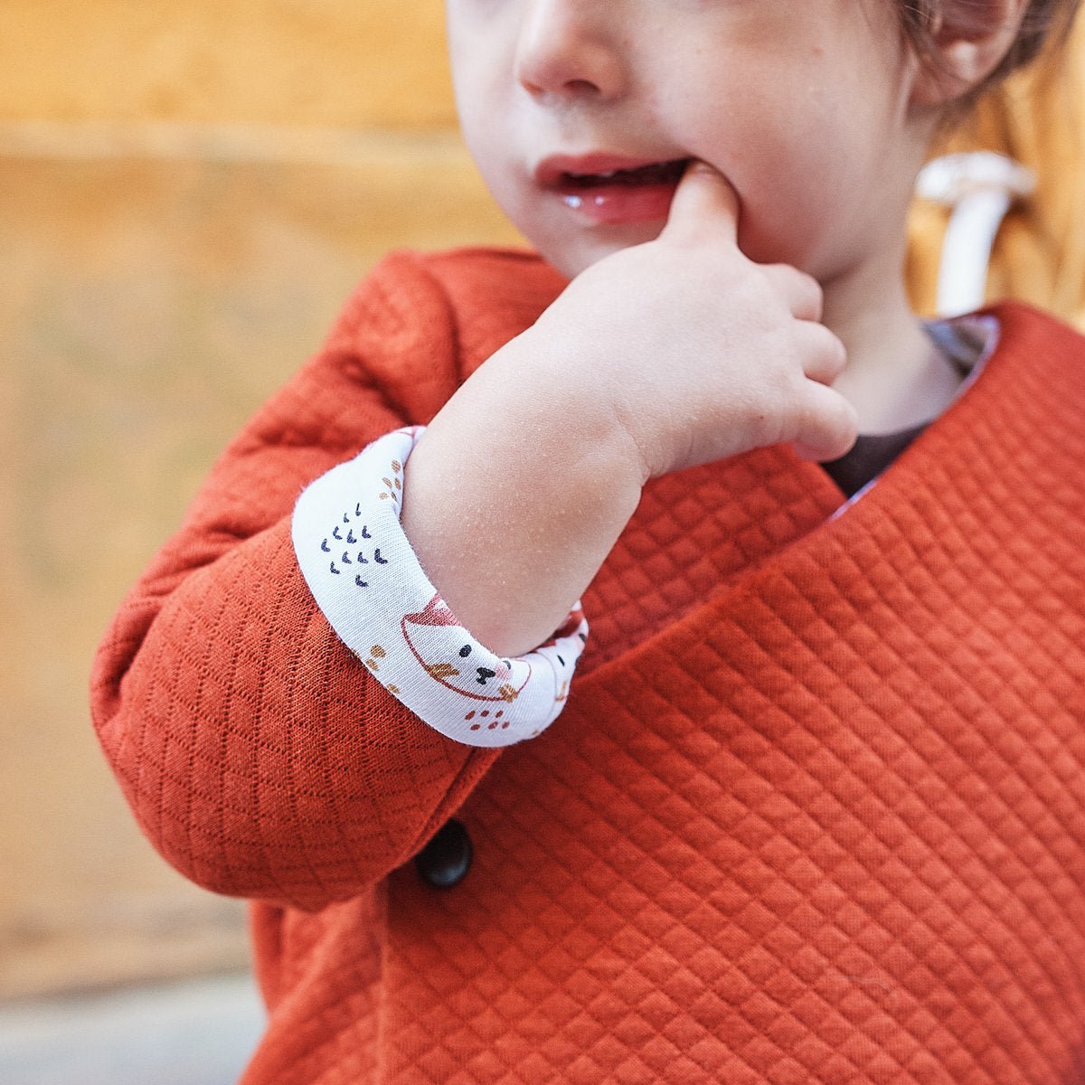 Fully lined and reversible cardigan.Closing by a band + button/ snap, simple button/ snap or with a tie.Kimono style neck band option.Peplum cardigan option.Loose dress option with gathered skirts.