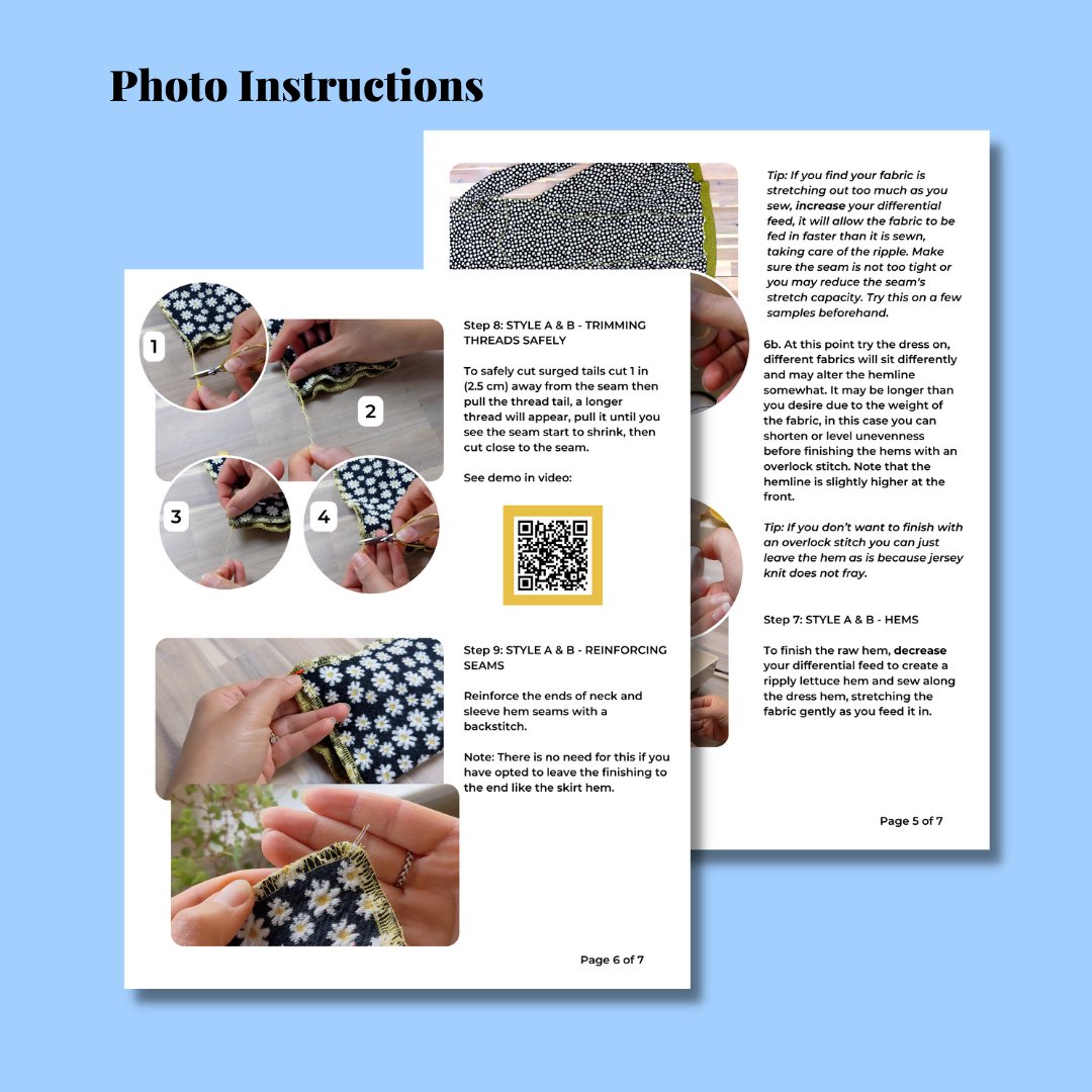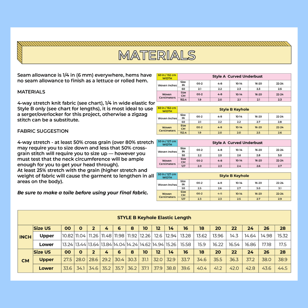 Materials needed: 4-way stretch knit fabric (see chart), 1/4 in wide elastic for Style B only (see chart for lengths), it is most ideal to use a serger/overlocker for this project, otherwise a zigzag stitch can be a substitute. You CANNOT make this in a woven, non stretch fabric.