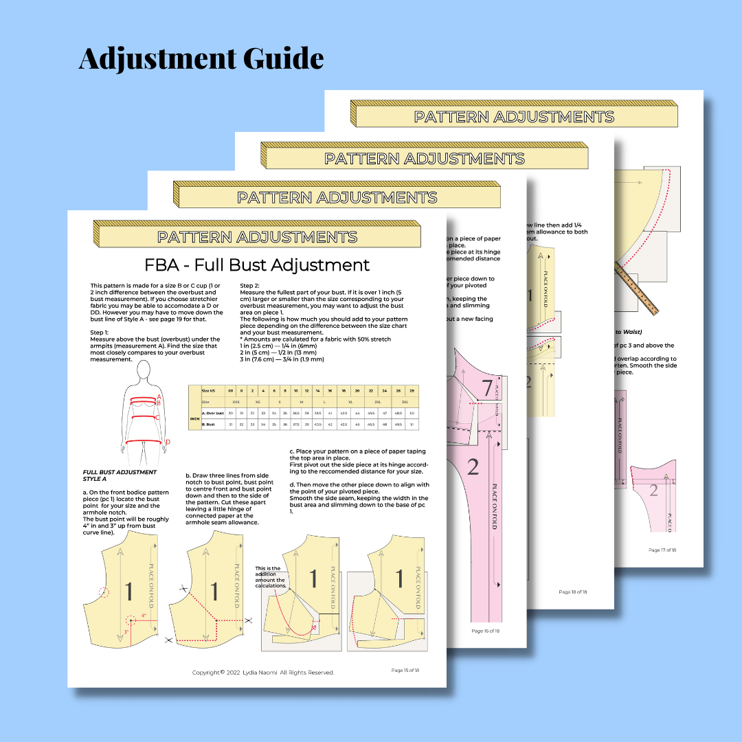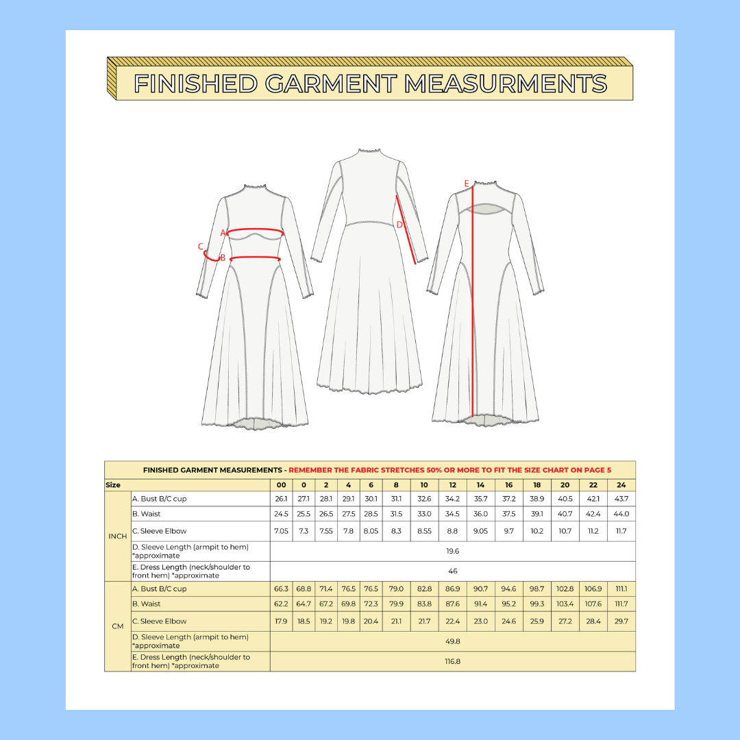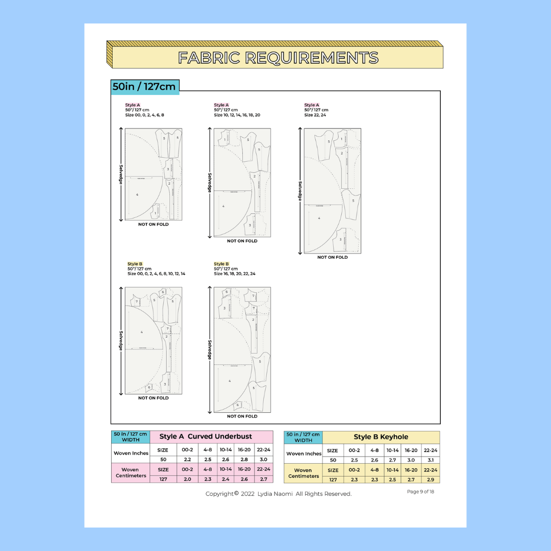 Size 00—24 see size chart. B/C cup.Choose your size based on your over bust and closest waist measurement. FBA , lengthening and shortening instructions included.Model is 5'4 (B:36 W:28 Hip: 38) wearing size 8.