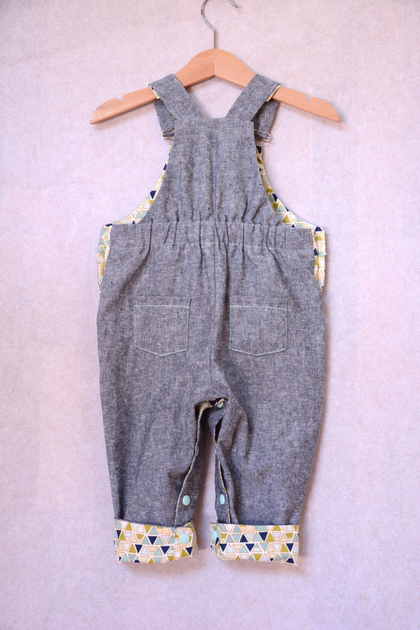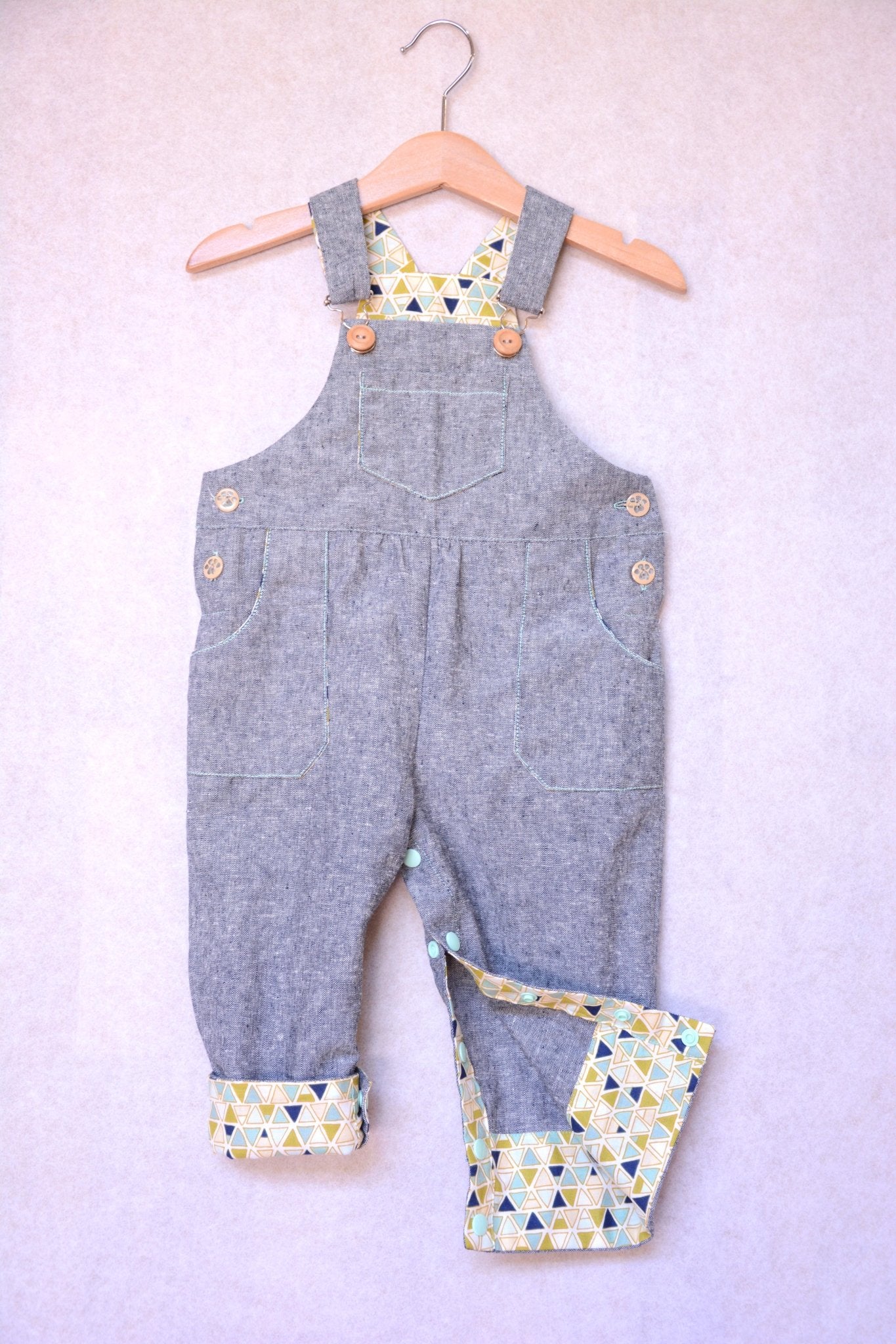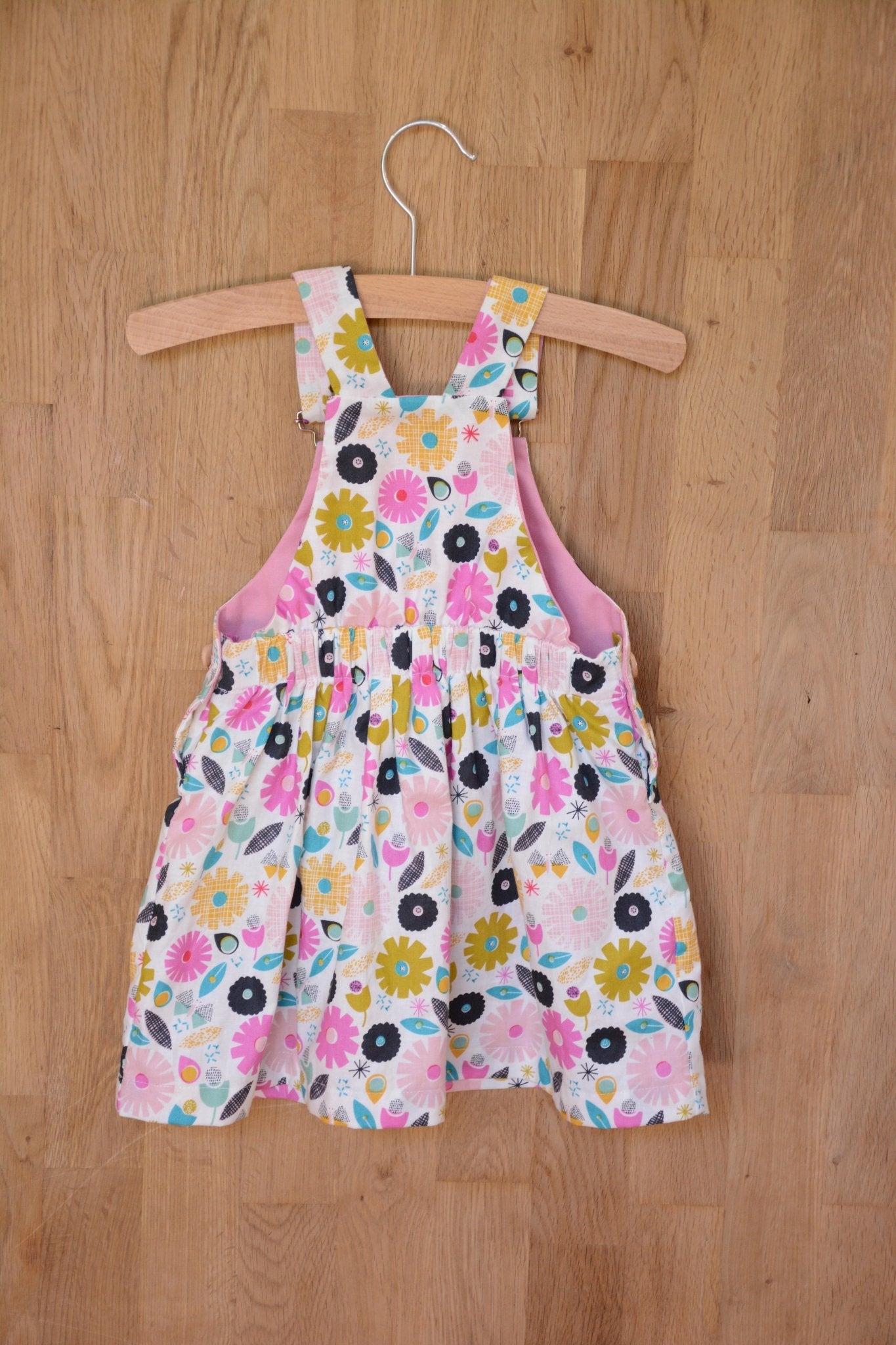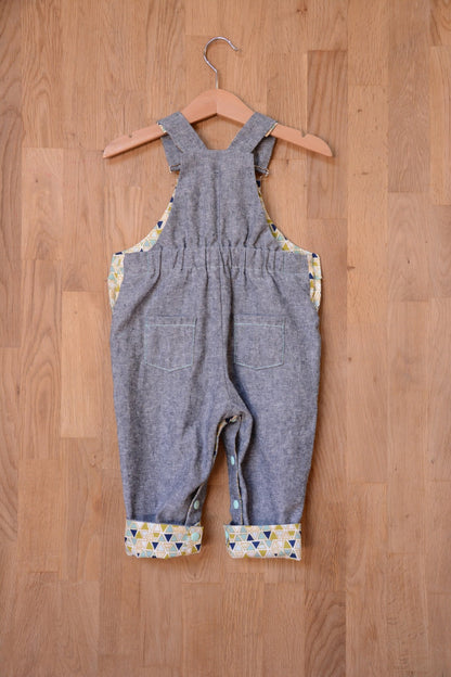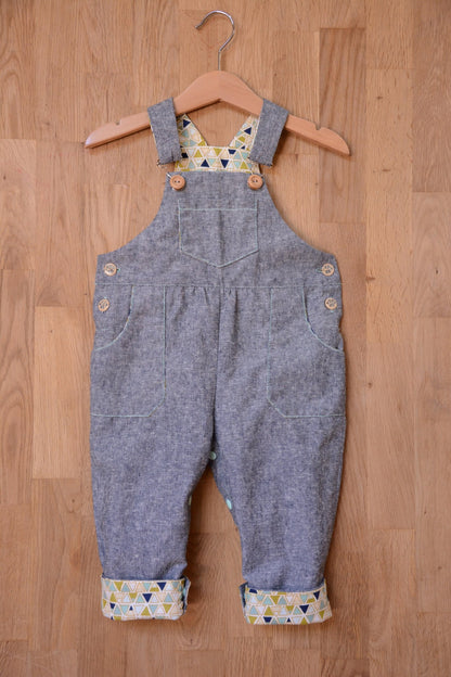 A unisex dungaree pattern for babies and toddlers, with contrast facing for straps, bibs, pockets and turn-ups. Keeping practicality in mind the pattern features snap fasteners on the inner leg, an elasticated back waist, and side buttons. A dress version is also included.