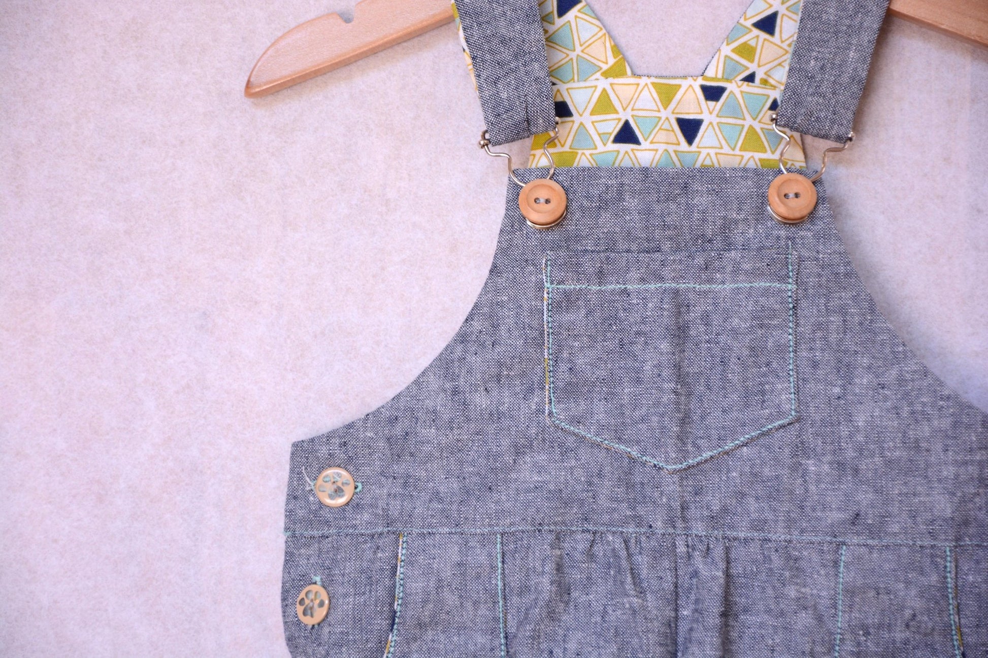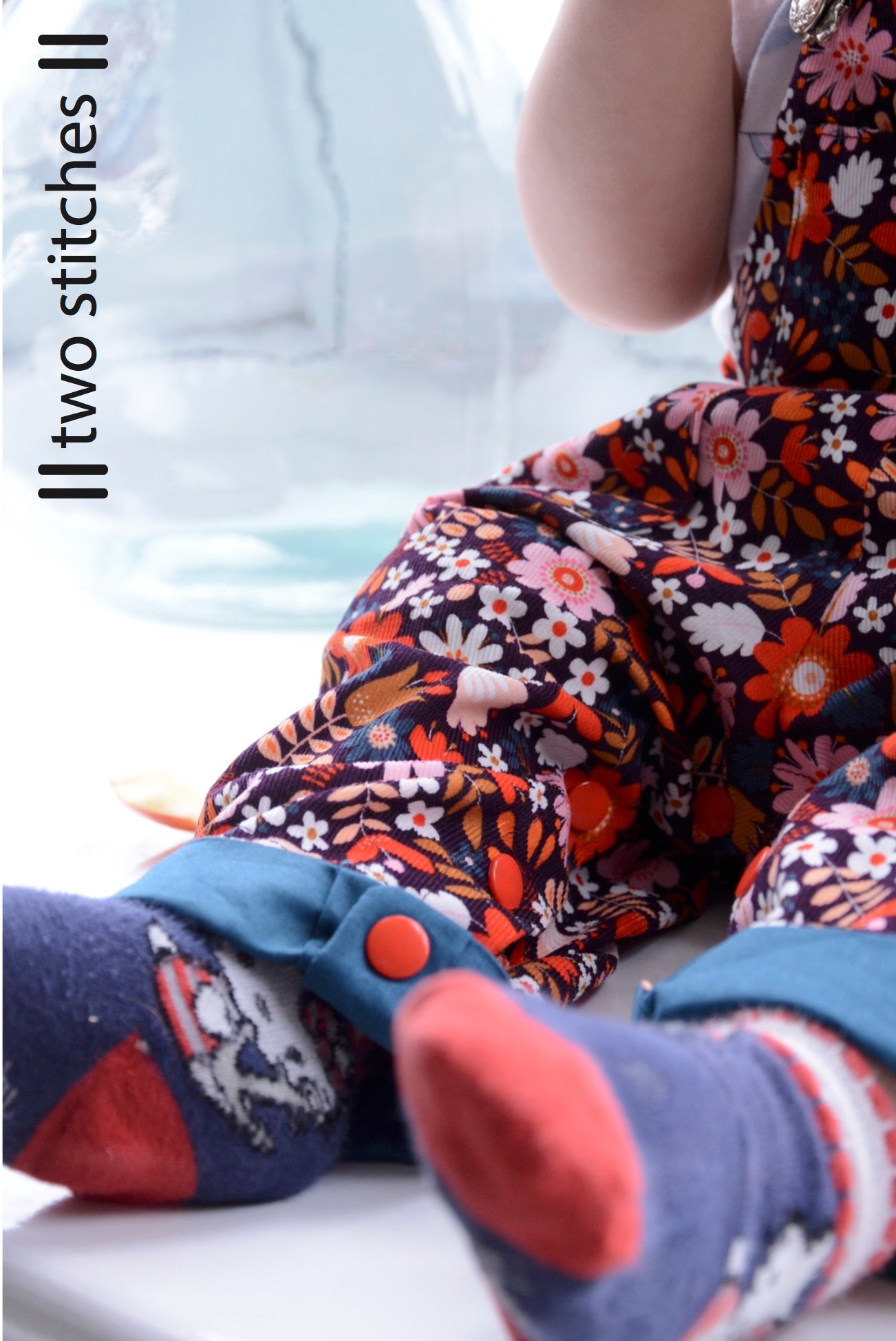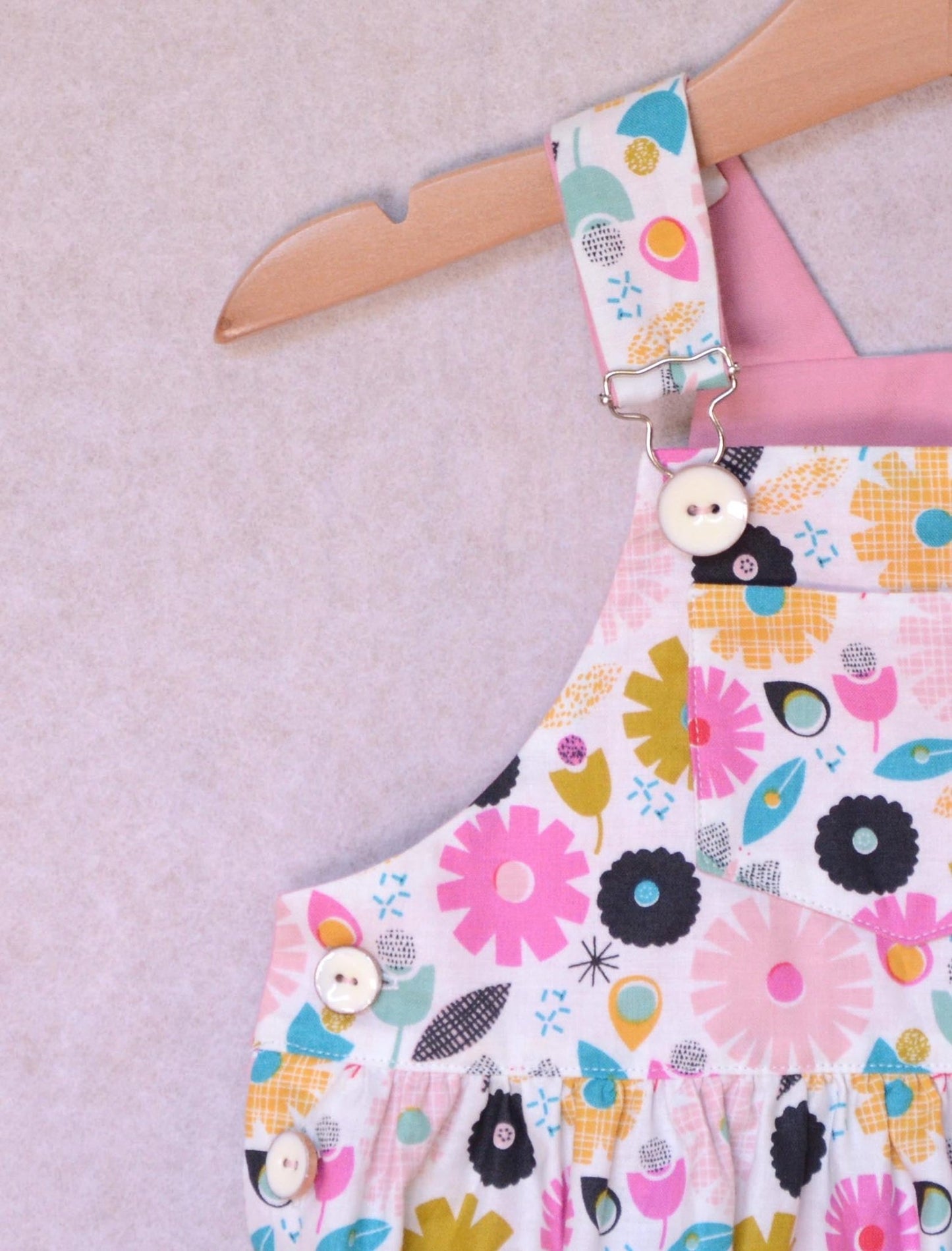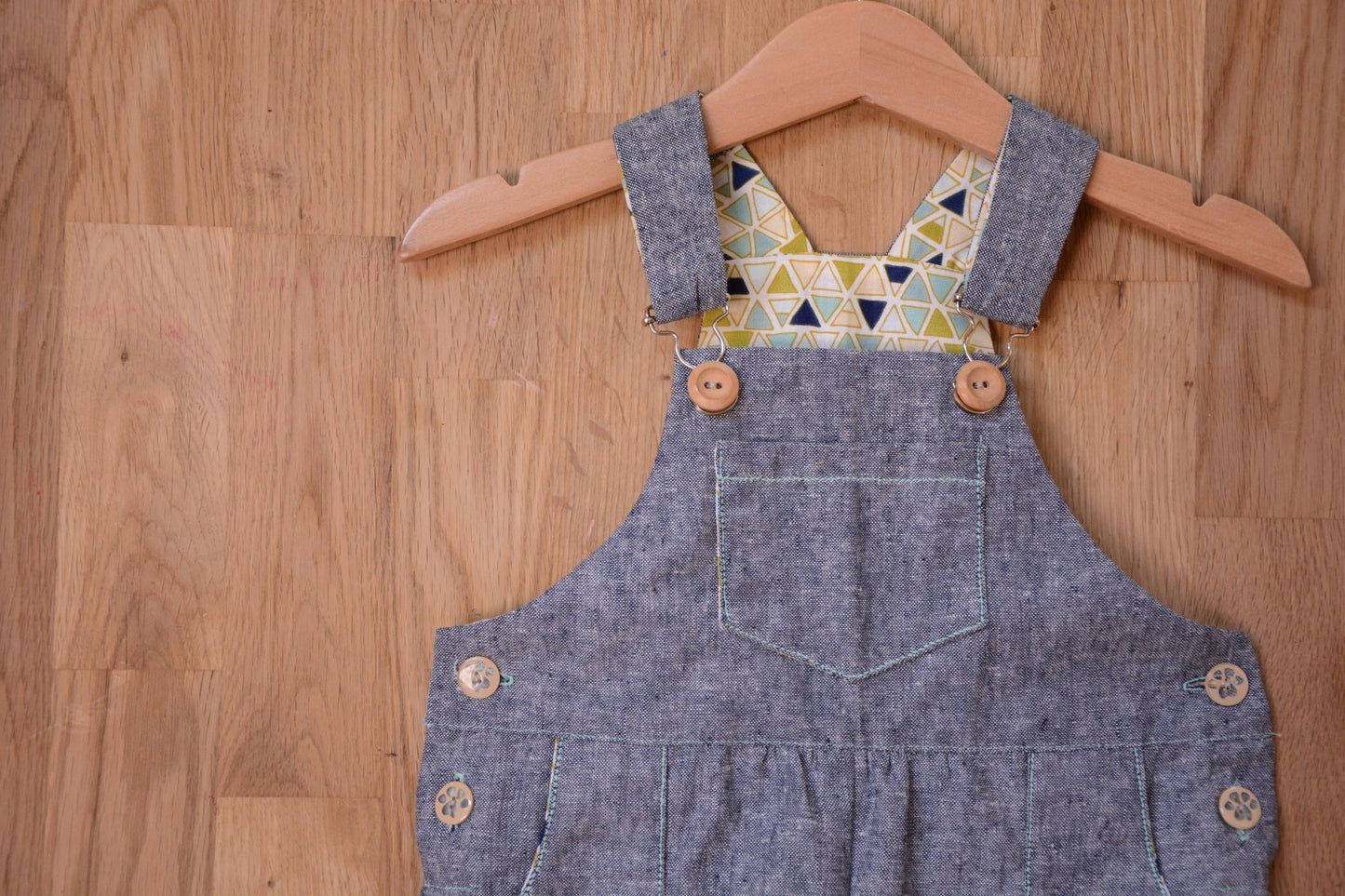 A unisex dungaree pattern for babies and toddlers, with contrast facing for straps, bibs, pockets and turn-ups. Keeping practicality in mind the pattern features snap fasteners on the inner leg, an elasticated back waist, and side buttons. A dress version is also included.