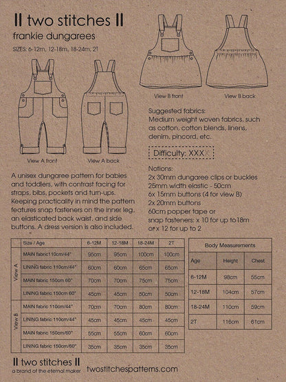 Frankie Dungarees & Dress (6mo-2years) - Kids Paper Sewing Pattern - Two Stitches Patterns