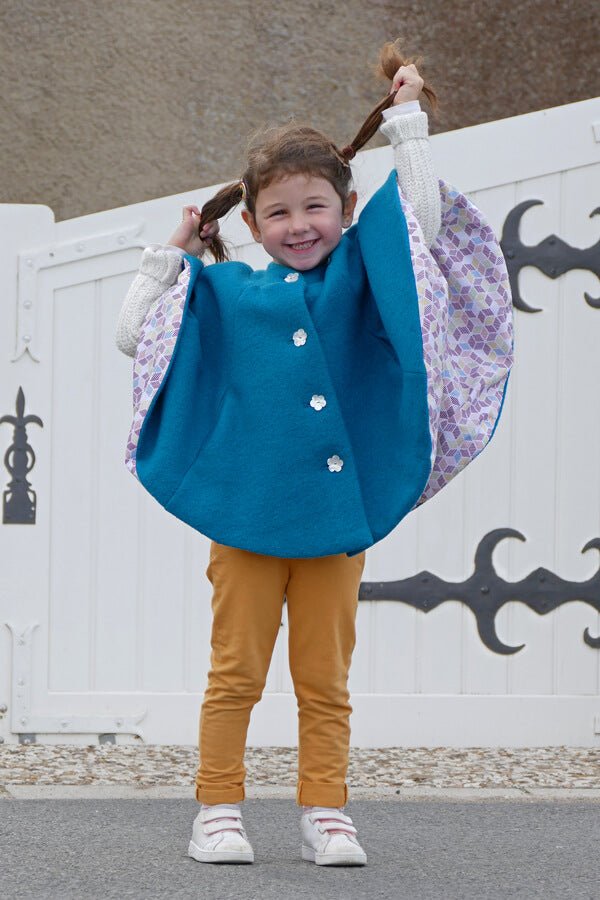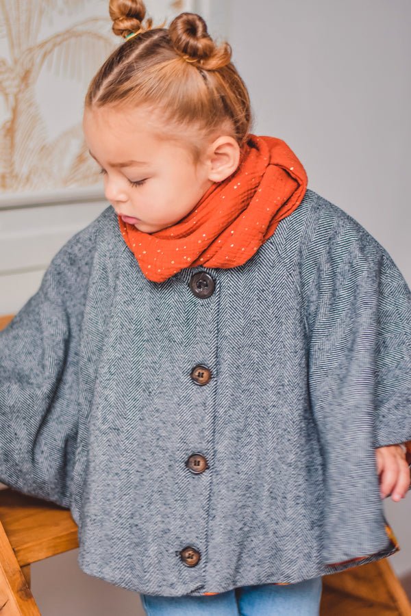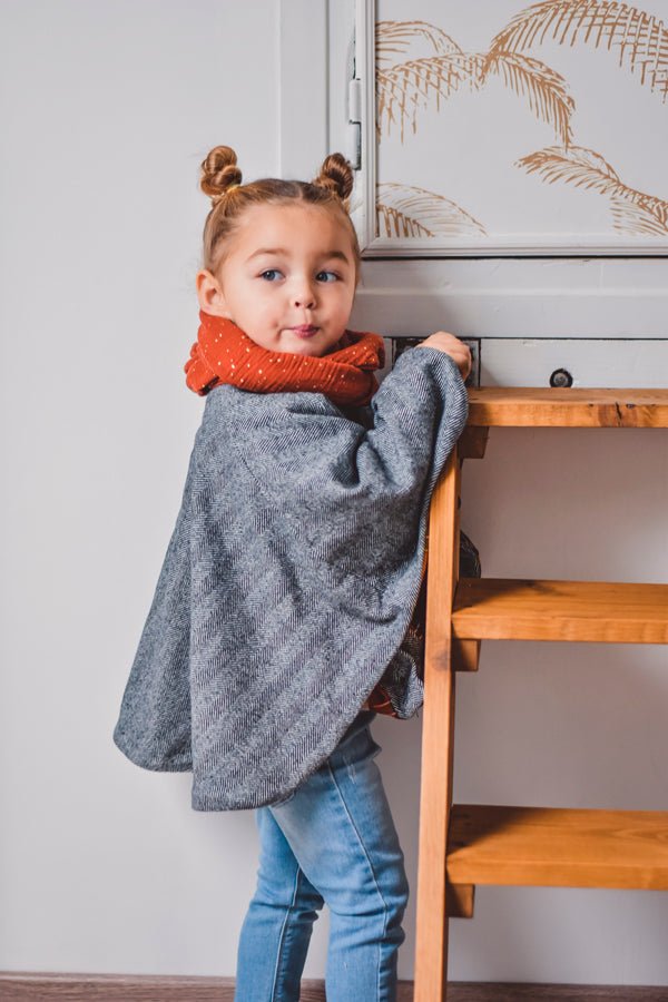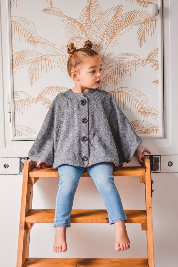 Léa, @peppattii‘s daughter wears a grey woollen cape made in size 4’.