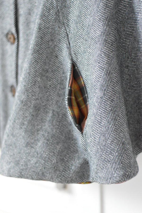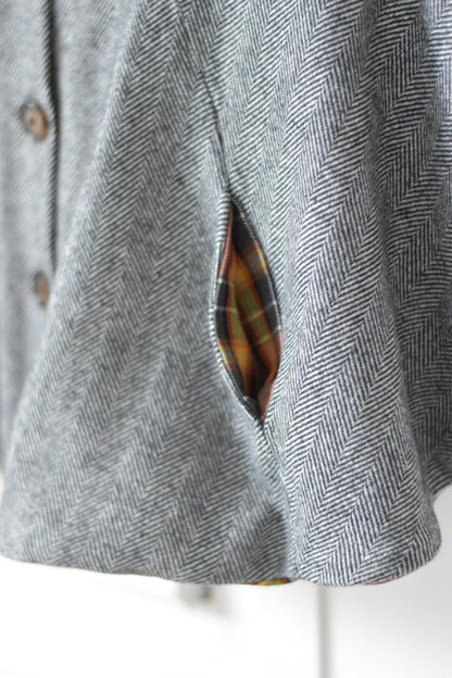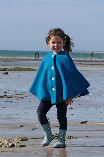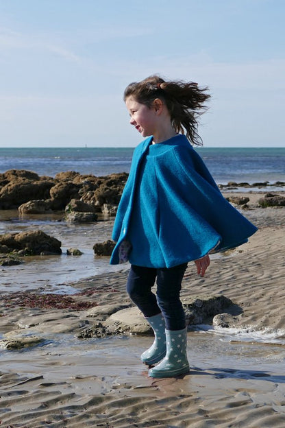 I am Harry Mini, a warm circle cape for children with in-seam pockets. My collar sits flat close to the neckline. For her comfort, I am fully lined. She’ll easily slip me on and off using the 4 buttons on the front button placket.