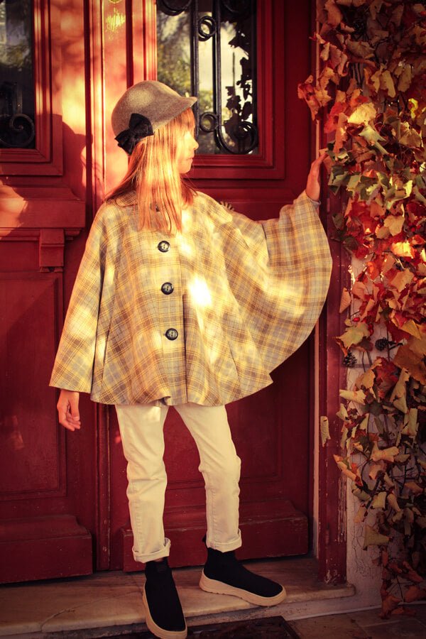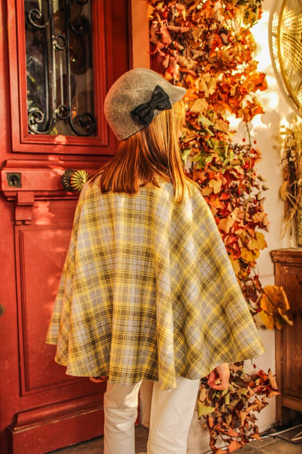 Mila, @lespipelettesontdesailes‘s daughter wears a green checkered cape made in size 6.