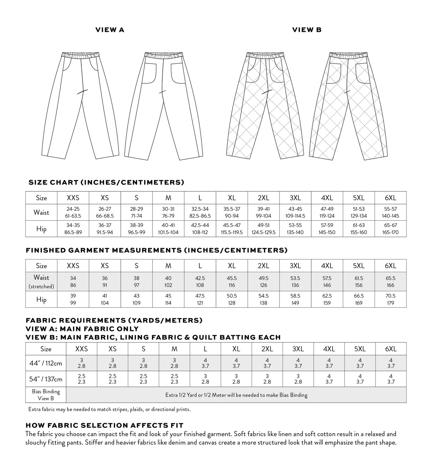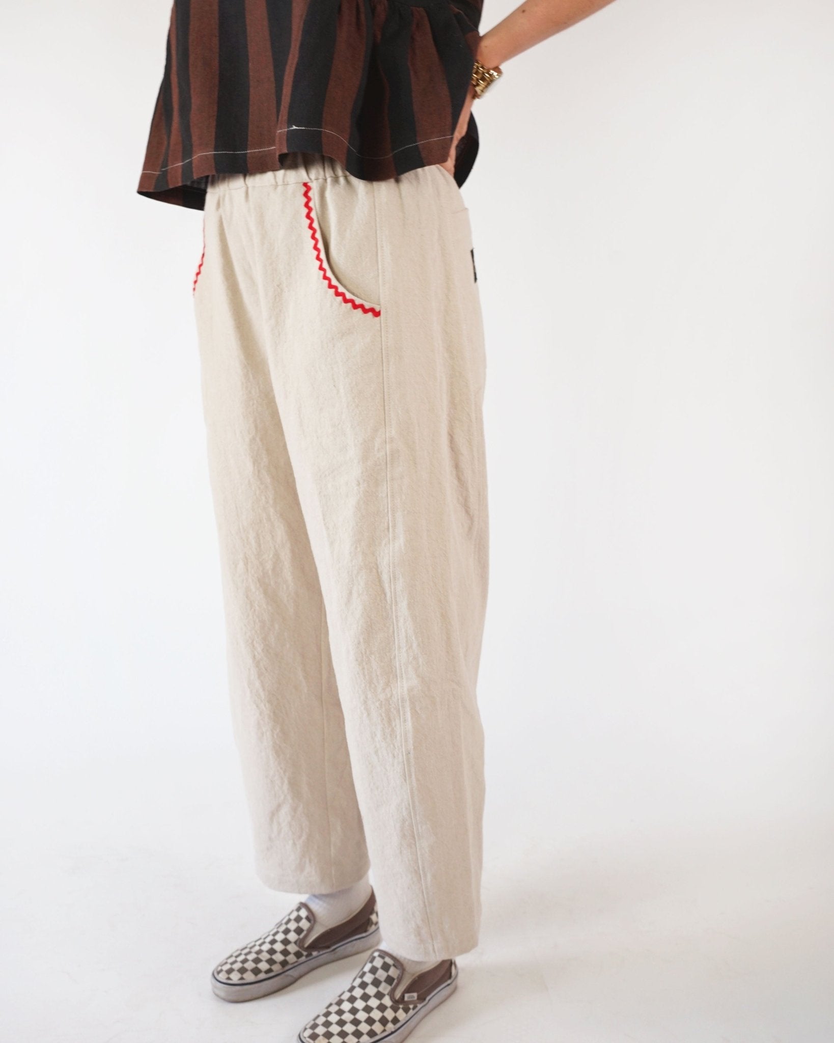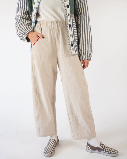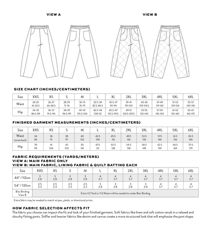 The Kite Pants are all about easy sewing and effortless style! Designed with beginners in mind (but great for all skill levels), this pattern comes together quickly and is packed with playful details. The high-waisted, ankle-length fit features a subtly curved leg for a relaxed, modern shape (think barrel-lite). A unique side inset detail makes the perfect canvas for patchworking, color-blocking, or using up those favorite fabric scraps. This fun silhouette includes two front pockets and two back pockets. The elastic waistband keeps things comfy, so you can wear them all day, every day. We’ve included a quilted version for the coziest winter pants ever. Whether you're lounging, layering, or heading out the door, the Kite Pants are as fun to make as they are to wear—and they’re sure to become a go-to in your handmade wardrobe.