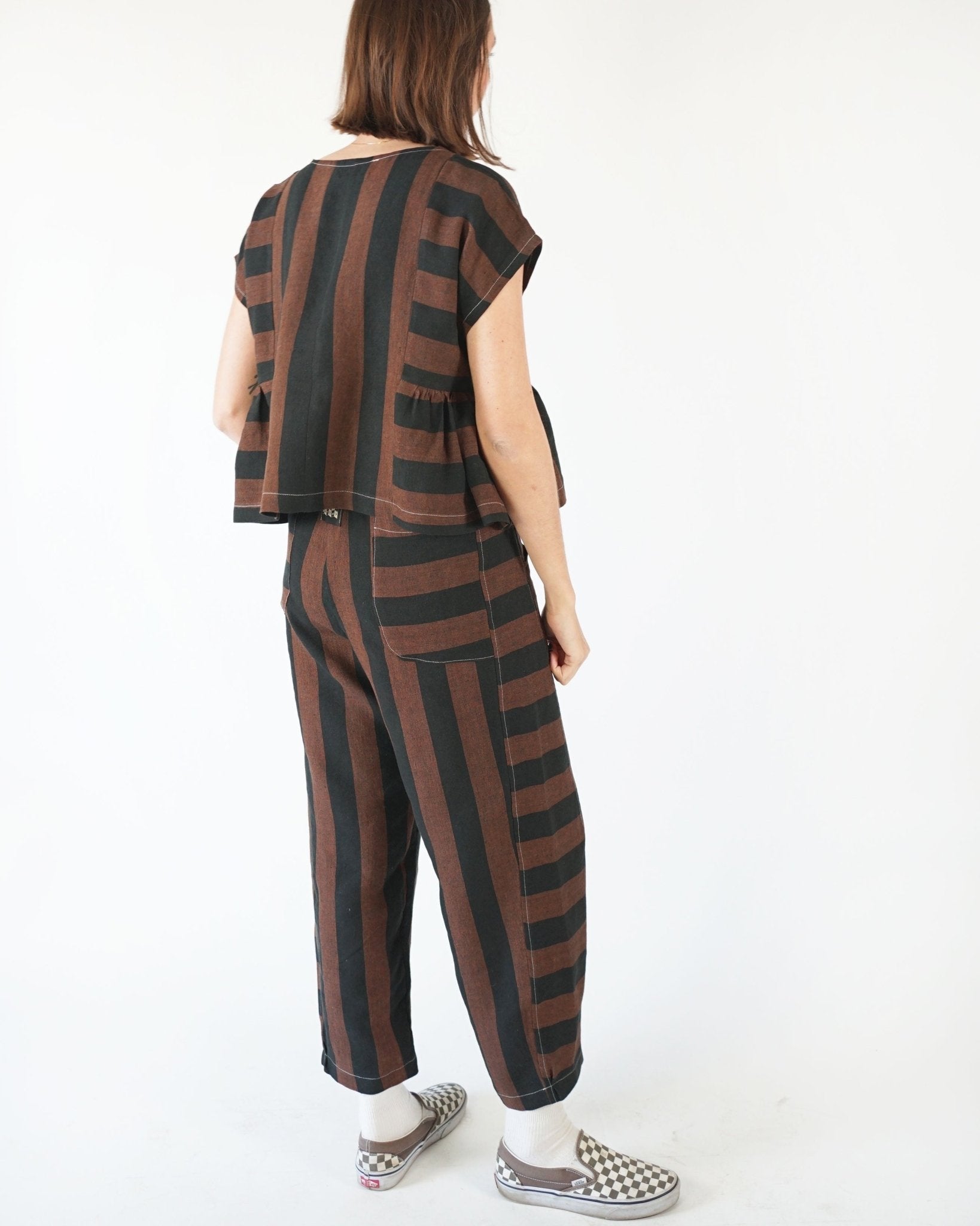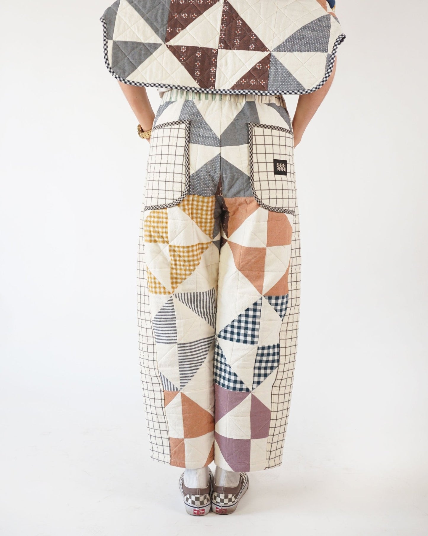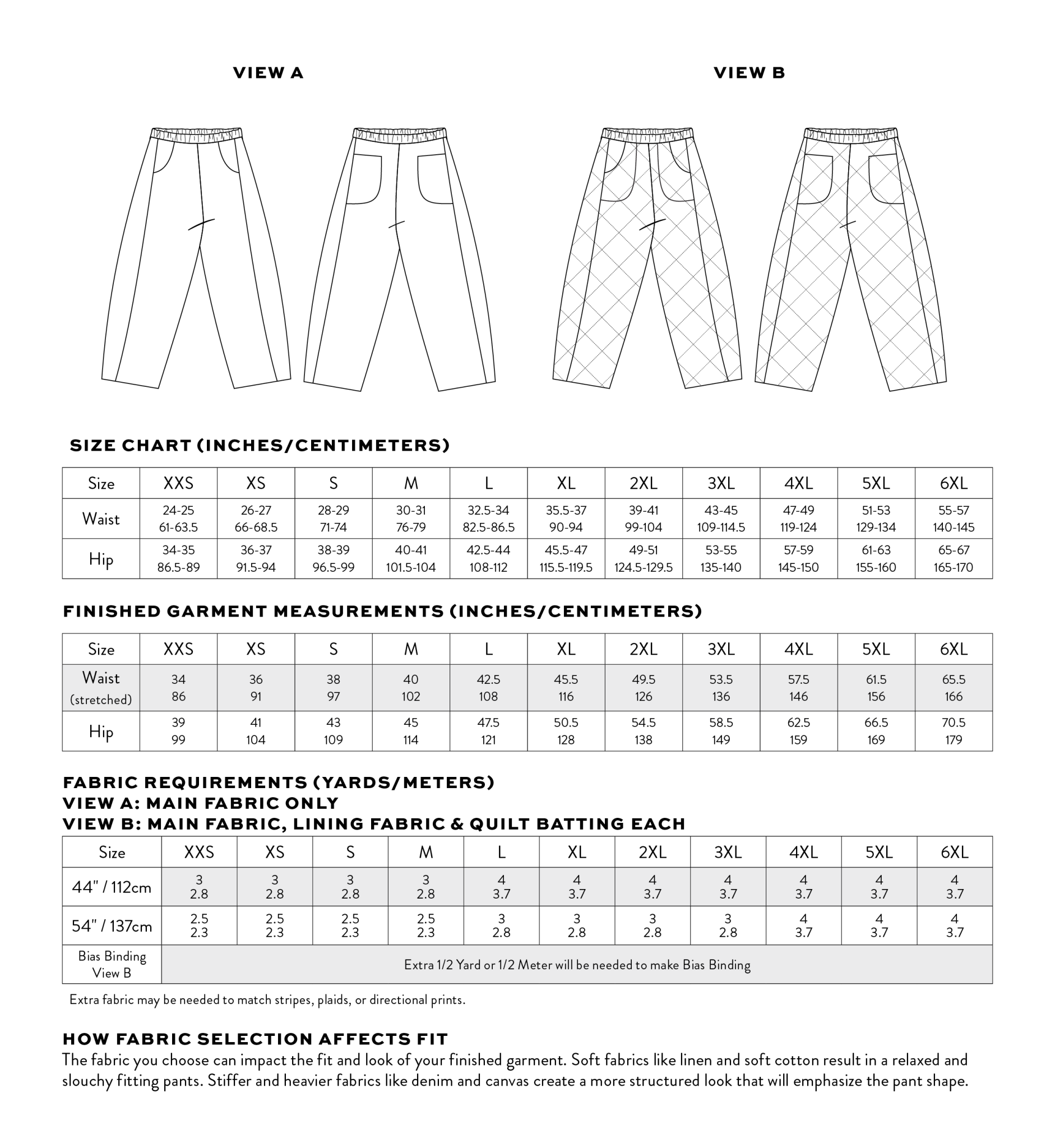 The Kite Pants are all about easy sewing and effortless style! Designed with beginners in mind (but great for all skill levels), this pattern comes together quickly and is packed with playful details. The high-waisted, ankle-length fit features a subtly curved leg for a relaxed, modern shape (think barrel-lite). A unique side inset detail makes the perfect canvas for patchworking, color-blocking, or using up those favorite fabric scraps. This fun silhouette includes two front pockets and two back pockets. The elastic waistband keeps things comfy, so you can wear them all day, every day. We’ve included a quilted version for the coziest winter pants ever. Whether you're lounging, layering, or heading out the door, the Kite Pants are as fun to make as they are to wear—and they’re sure to become a go-to in your handmade wardrobe.
