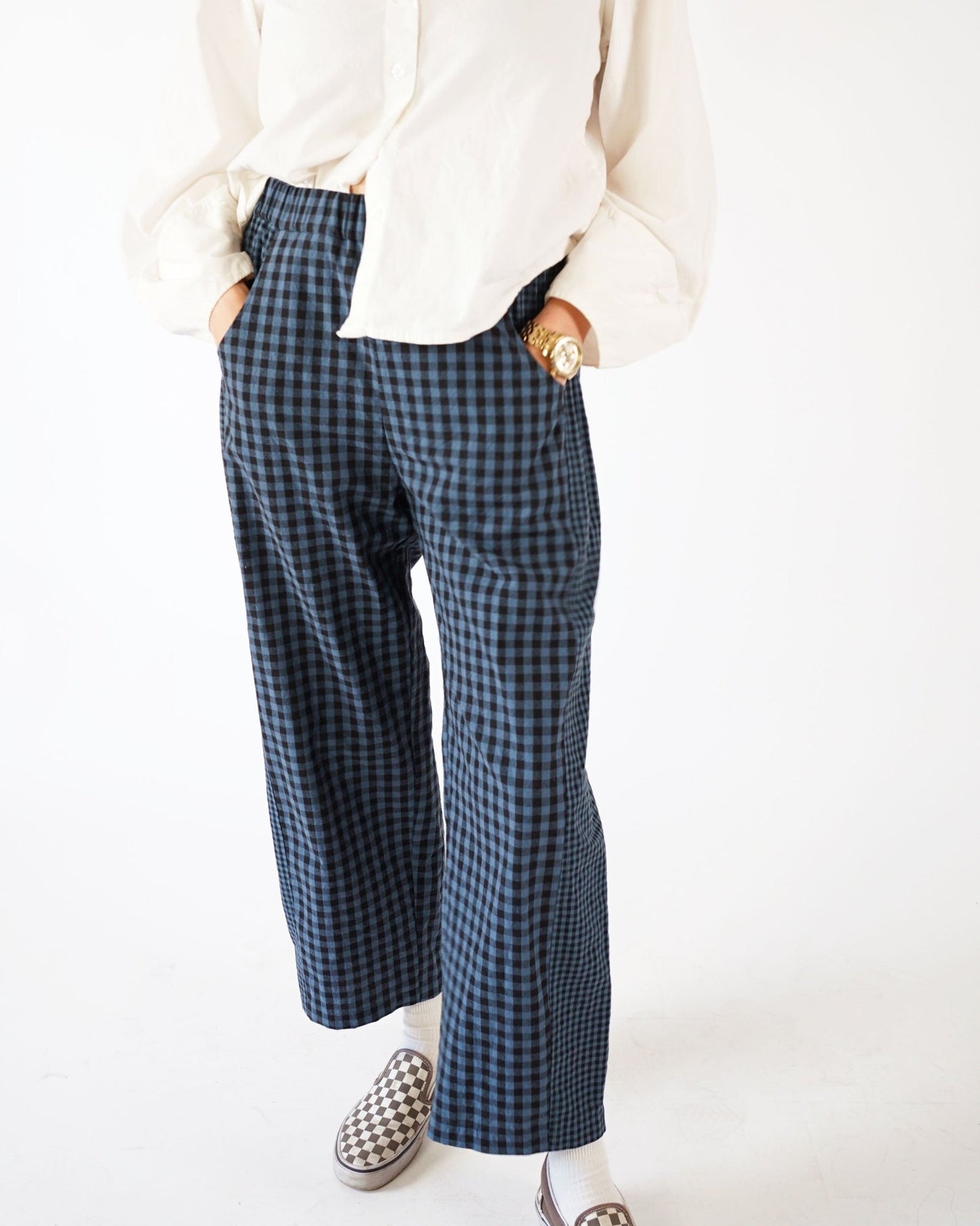 Morgan is 5'9". She is wearing a size small in the black and brown stripe pants and the quilted pants. She is wearing a medium in the white pants and the blue and black gingham pants.