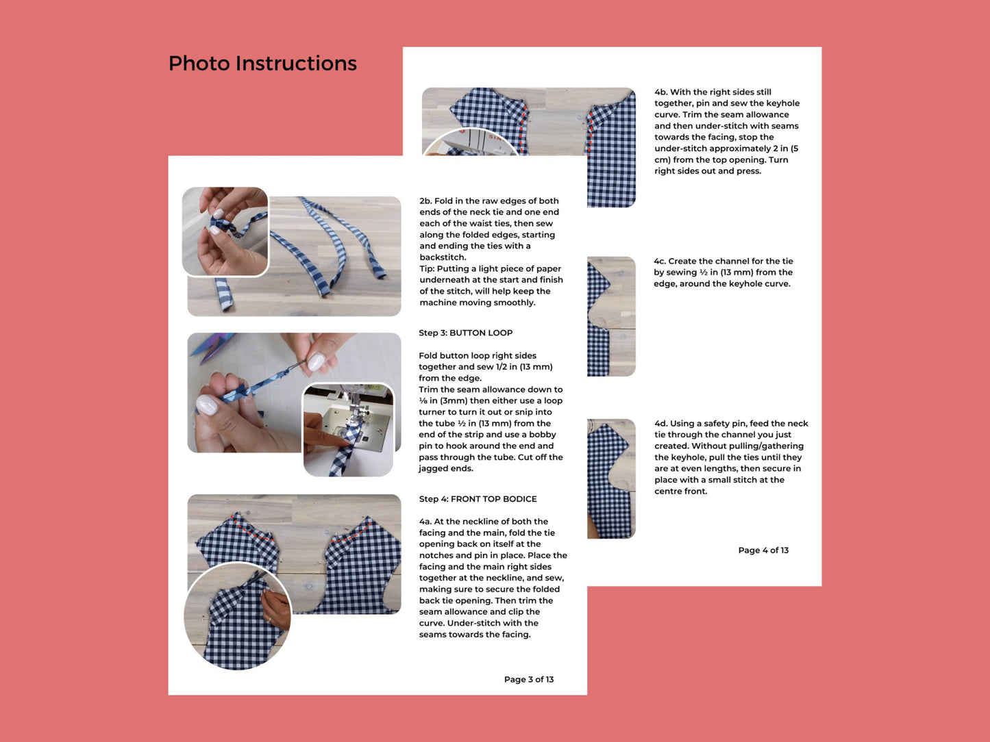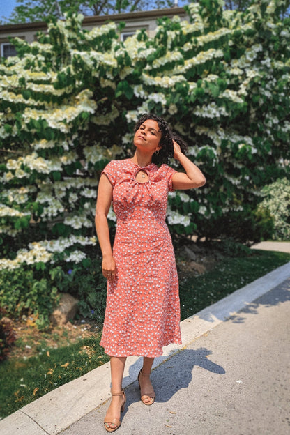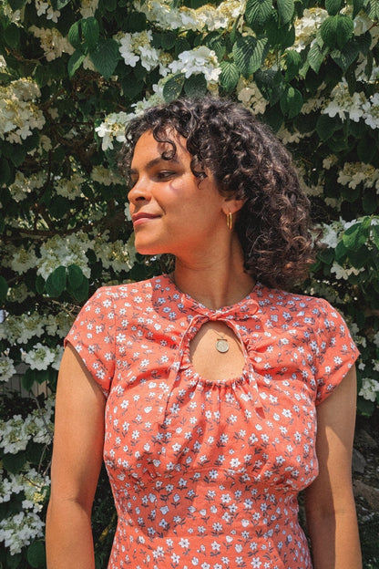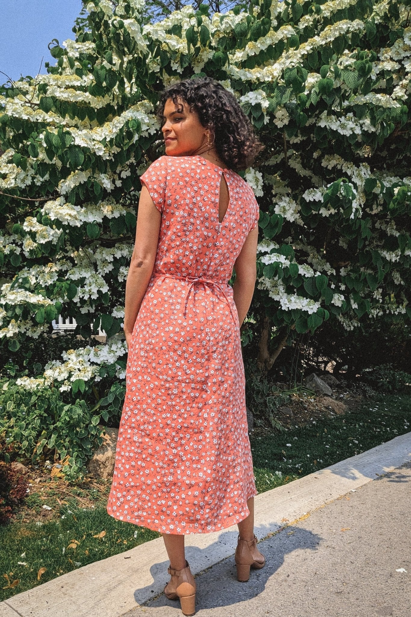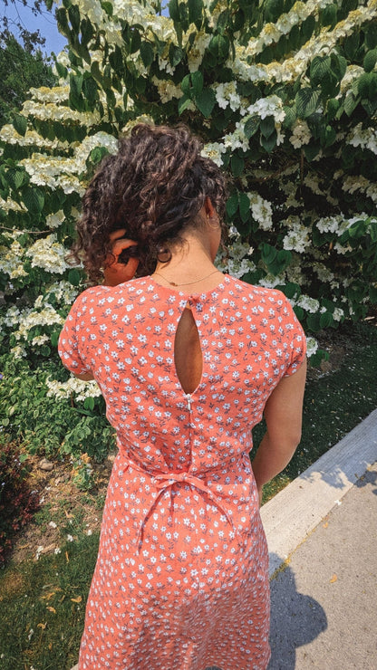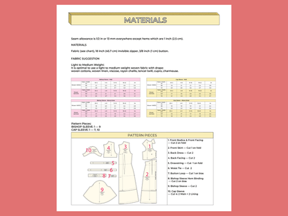 The Lark Frock features a front bodice drawstring keyhole and a gently gathered curved bust line. It has a slim A-line skirt with room in the back for comfort and waist ties to cinch your waist if desired. The back also features a buttoned keyhole at the neck and there is an optional dart if you want a cinched back waist. You can decide between a bishop 3/4 sleeve or cap sleeve. The pattern includes both a calf length and an above-the-knee length. And to make this all season appropriate there are instructions for how to make a full length bishop and fitted sleeve in the Read-First file.