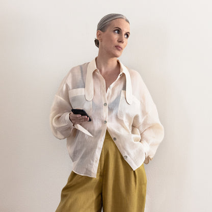 Phen, the not so classic, classic shirt. The Phen shirt has a super breezy drop shoulder and batwing style sleeve balanced by a nipped-in high hip hemline and cuffs. Three collar and two cuff options to choose from to mix and match for three very different looks.