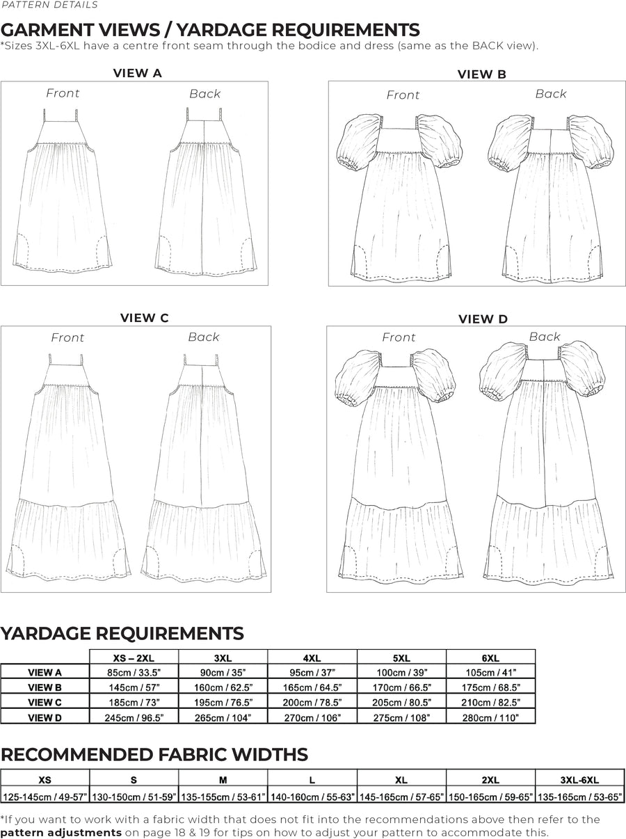 *Based on using a fabric that is 145cm / 57 inches wide. You can make this dress larger or smaller by choosing a fabric with a wider or narrower width.