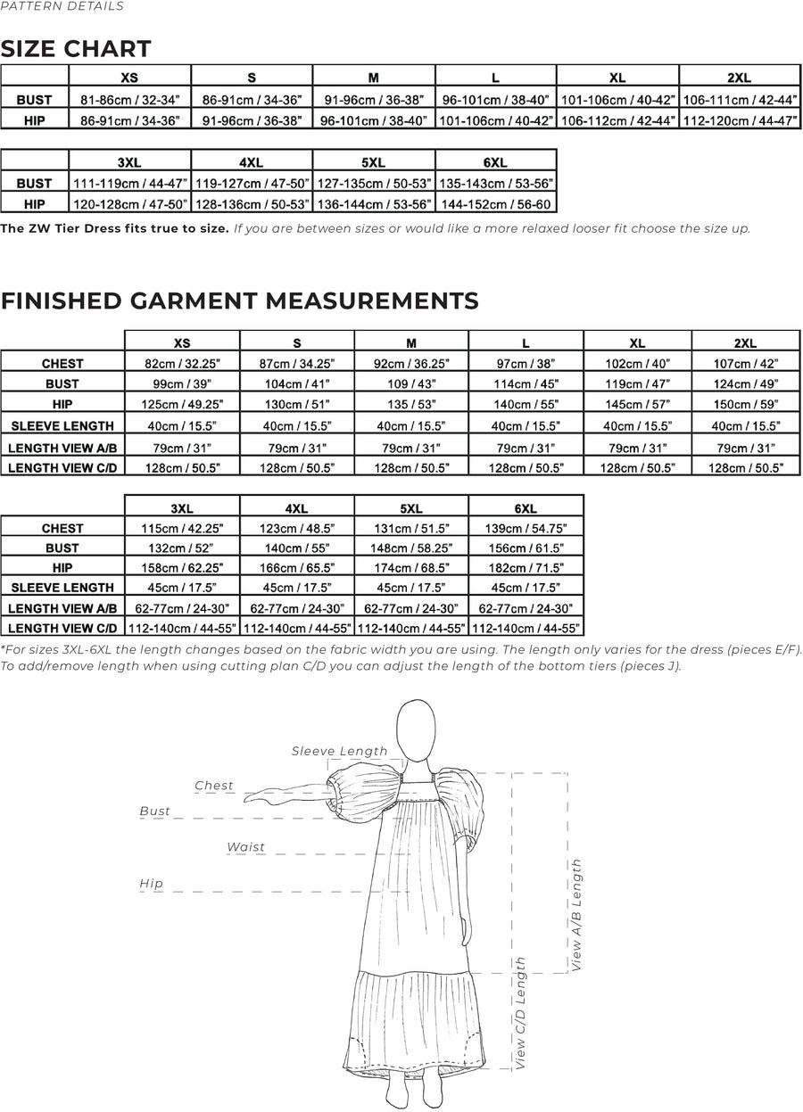 The ZW TIER DRESS is made up of 3 separate cutting plans which can be mixed and matched to make 4 different dresses. A short dress with thin straps, long dress with thin straps, short dress with sleeves and long dress with sleeves. If you are not using the sleeve then the strap for the dress will need to be cut from a contrast or remnant fabric. This dress has an above the bust self lined panel, the A-line dress below this is gathered on. There is also a bottom gathered tier that can be added to the dress and a gathered sleeve with an elasticated hem. The sleeve is hand sewn to the strap and underarm after the dress has been fully made. There are 2 different pattern layout options for this dress, which vary slightly depending on what size you are using.
