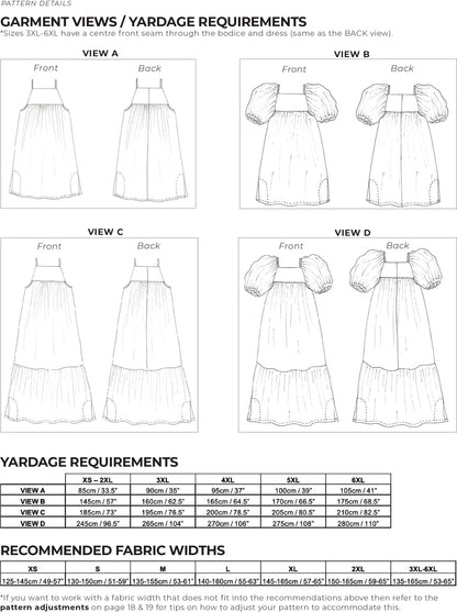 This pattern comes with 10 size options, an XS-6XL (hip 86-152cm / 34"-60"), with all sizes included in the one pattern purchase. There is a separate cutting plan booklet for sizes XS-2XL and 3XL-6XL which include detailed measurements and templates.