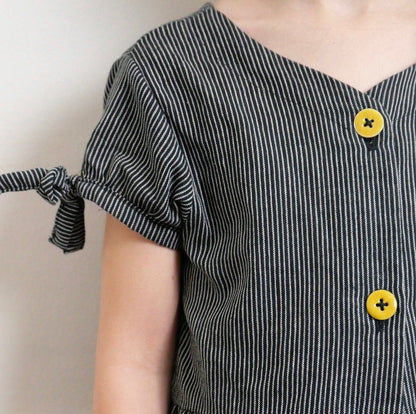 What you will practice with this sewing pattern: how to assemble a facing, how to sew patched pockets, how to gather, how to assemble fancy short sleeves, how to do French seams.