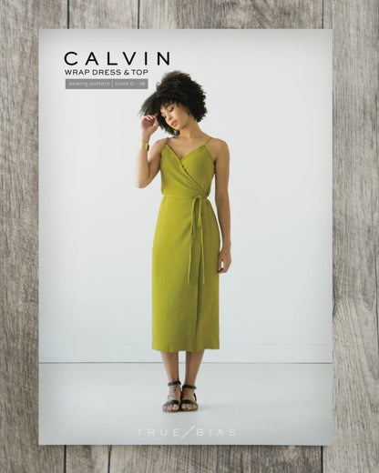 The Calvin pattern is a wrap dress and top with exposed bias binding that extends into long ties to form a bow closure. It has rings and sliders which create adjustable shoulder straps for an easy fit. View A is a short top that hits approximately two inches below the natural waist. View B is a straight dress that hits at mid calf.