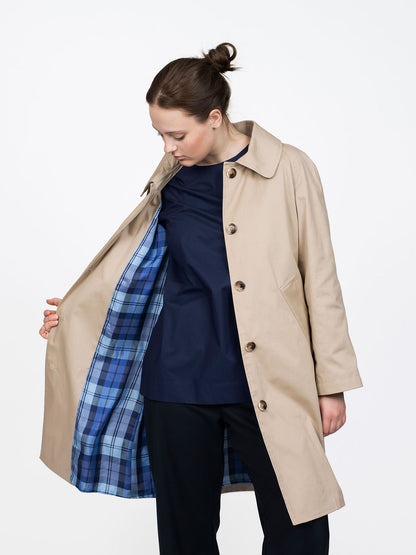 The classic car coat constructed for a modern wardrobe. It is slightly a-lined with a relaxed fit, features raglan sleeves and front welt pockets. Can be sewn with or without full lining.