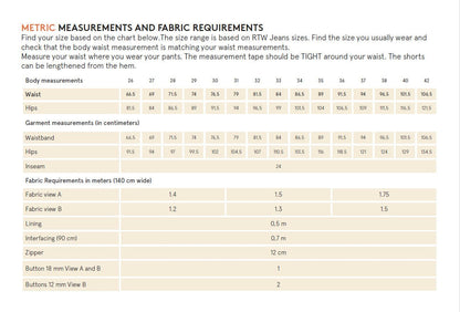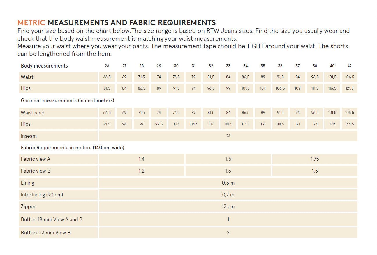 The model shown is 175 cm tall and wears a size 36. The female model wears size 31. Check out our images for more details on measurements and fabric requirements!