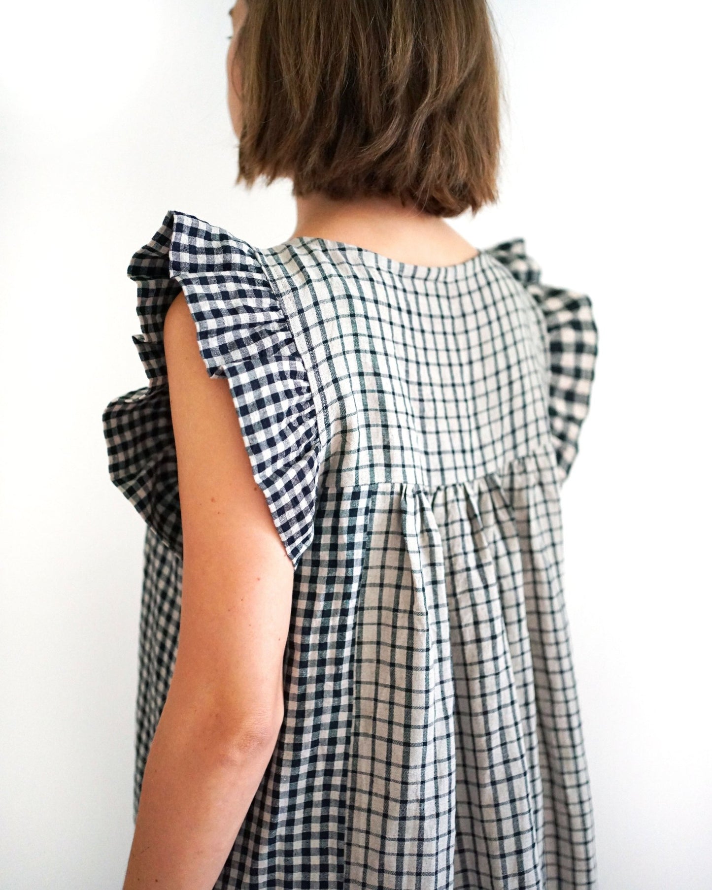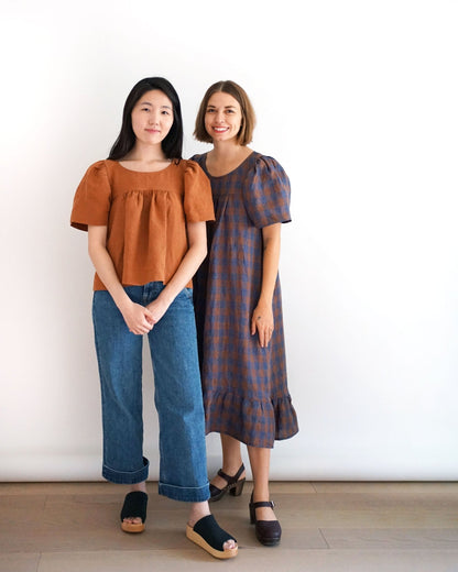 The Champagne Field Dress is a prairie style dress with patch pockets and optional patchwork view with inseam pockets. The front and back bodice include soft gathers that sit above the bust. View A is a mini dress, hitting above the knee and includes a flutter sleeve. View B is a midi dress, hitting mid calf with a high-low hem and gathered puff sleeves finished with a wide elastic cuff. Both views include a large bottom ruffle. View C is a babydoll style top which include soft gathers that sit above the bust and has a flowing bell sleeve. The length is semi cropped that hits right below the natural waist.