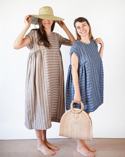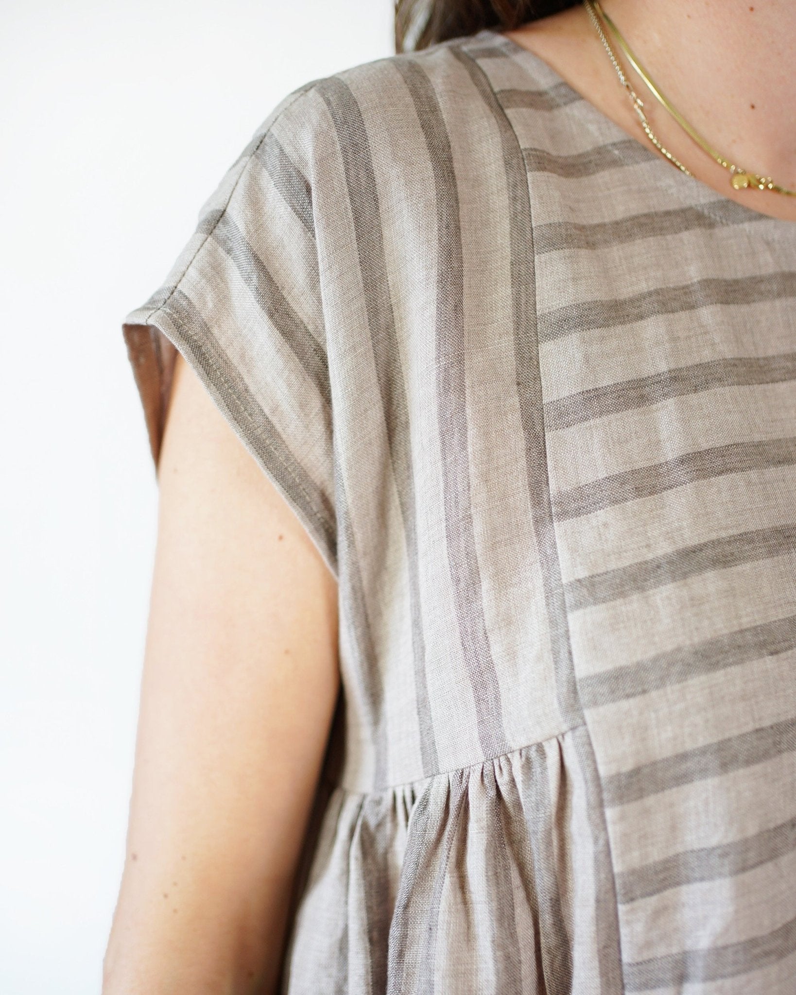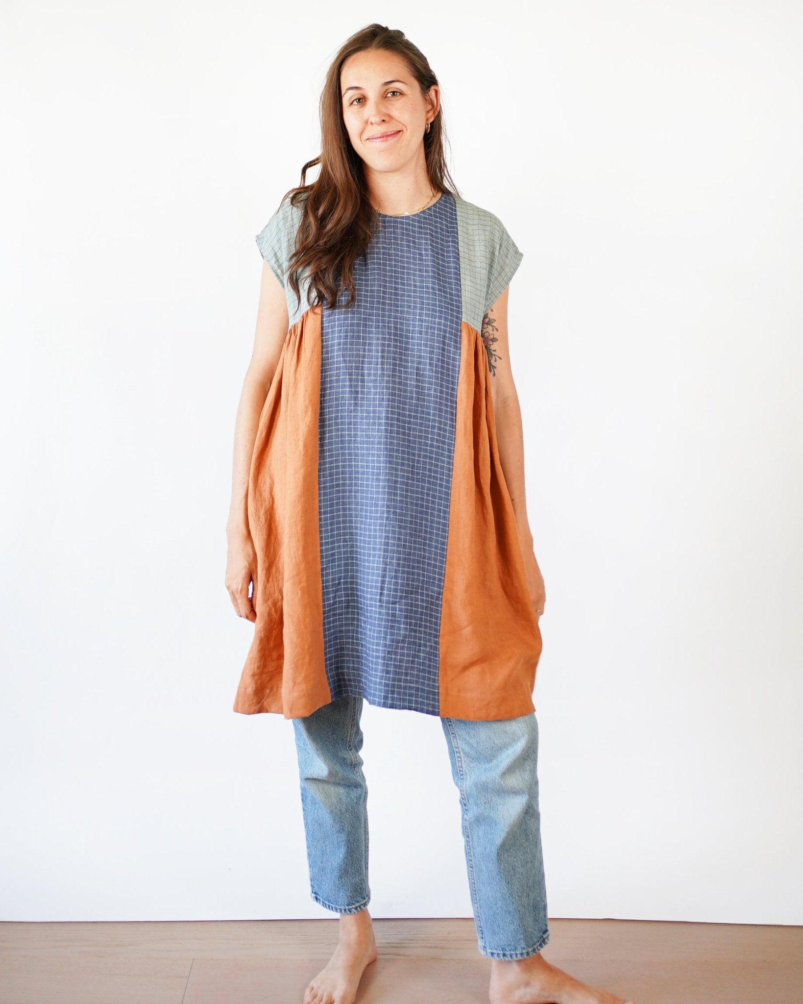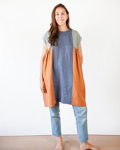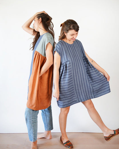 The Collage Gather Dress has a relaxed boxy fit with soft gathers on the side for a little extra shape and movement. The dress has hidden inseam pockets and comes with multiple dress lengths marked directly on the pattern from mini to maxi. Designed to be sewn as a patchwork or with a single fabric, it is fun to sew, easily customizable and comes together quickly.