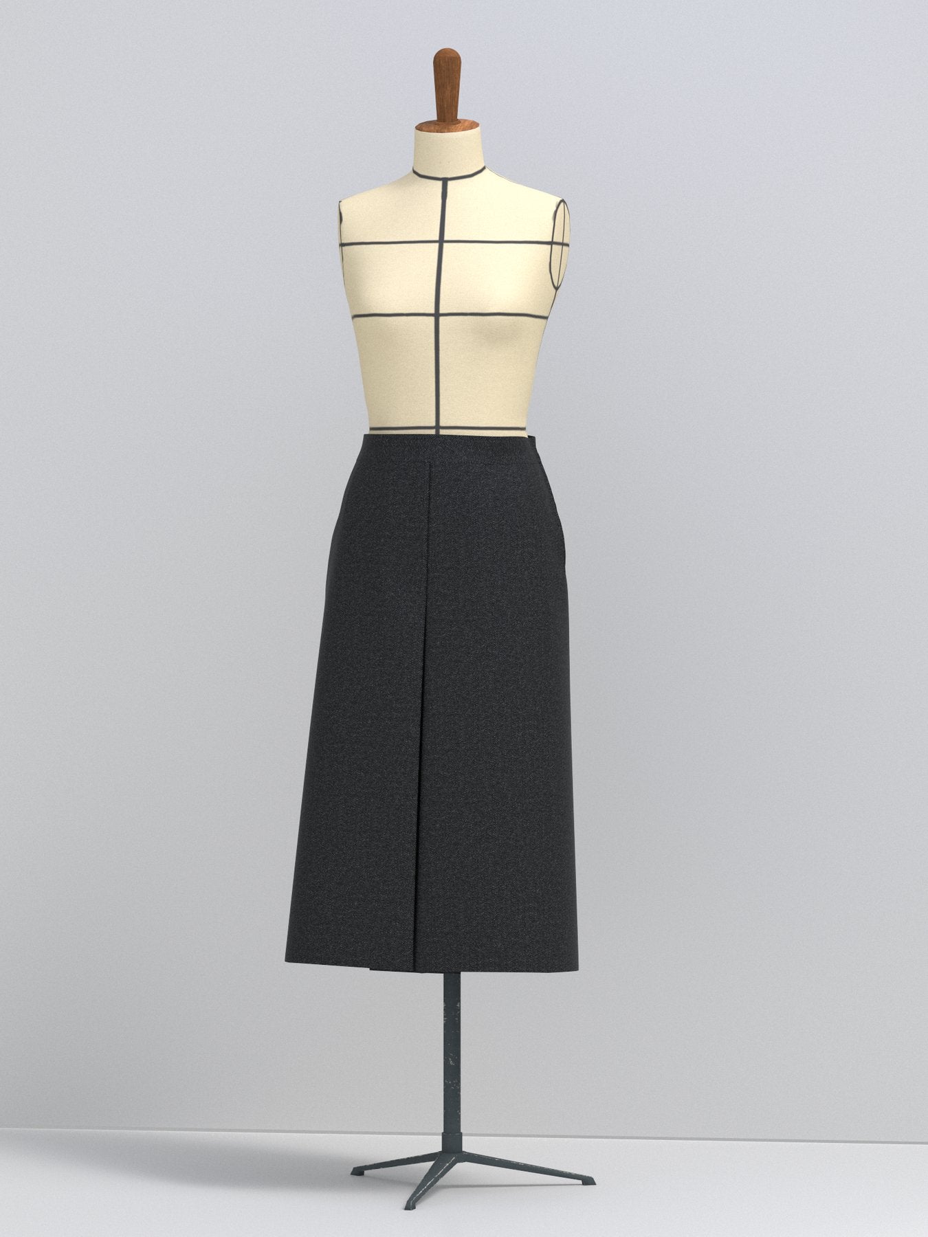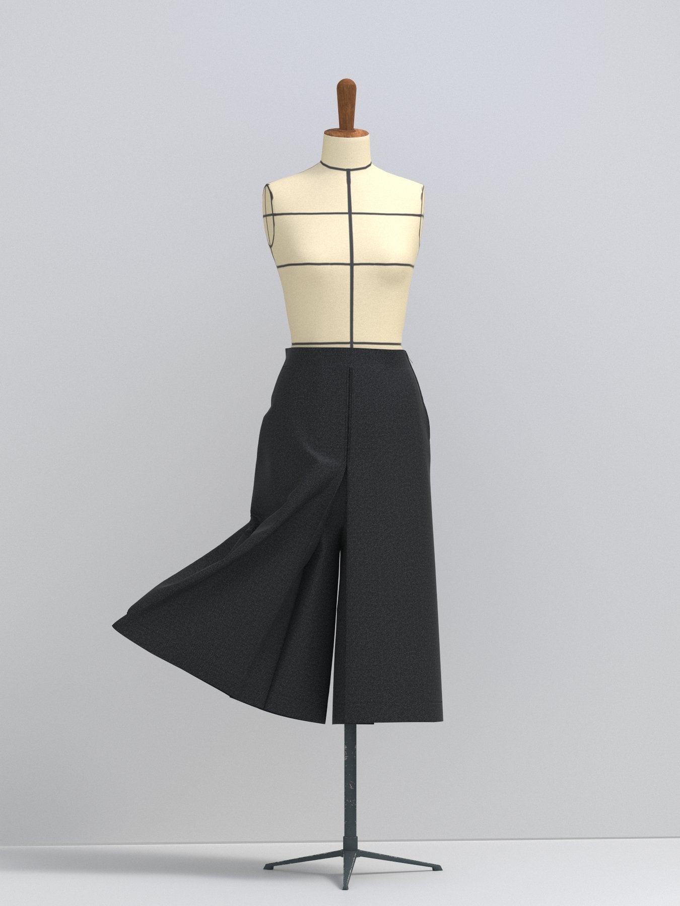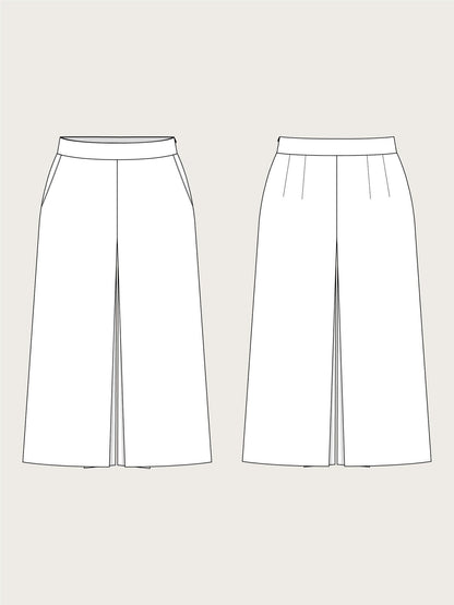 The cropped trousers are high waisted and wide legged with box pleats mid front and mid back, giving the finished garment a plain upper front and back. The leg volume is hidden along the inner leg seam. They feature side pockets and left side zipper opening.