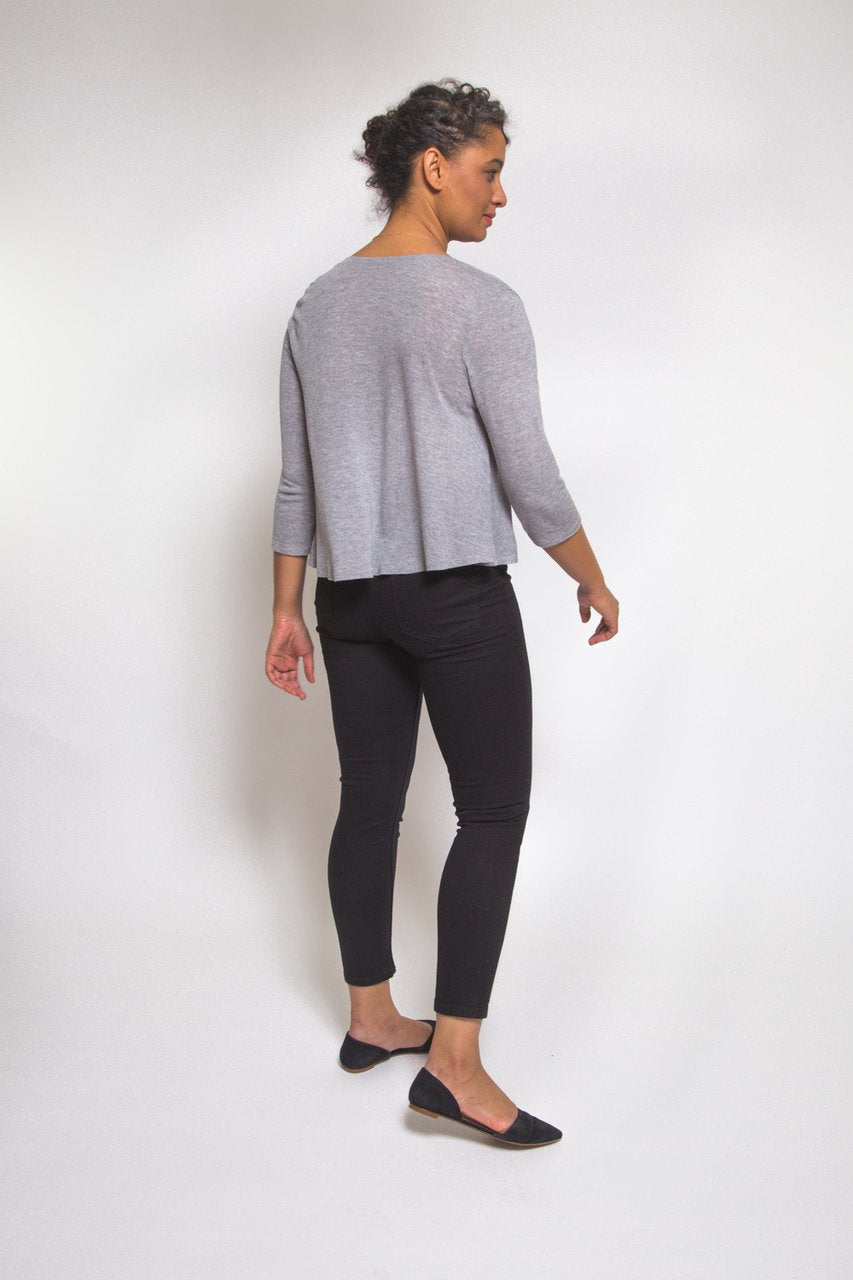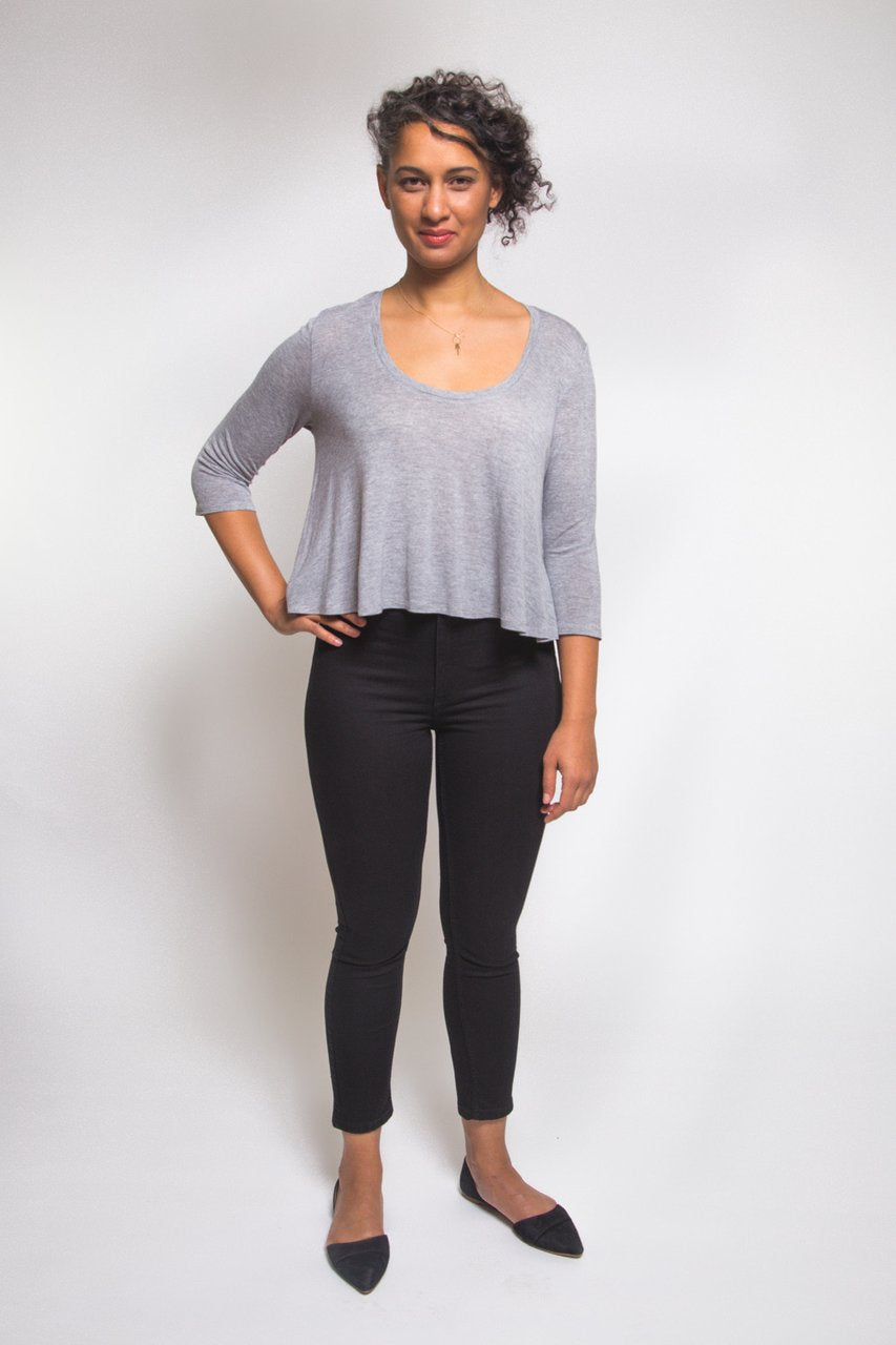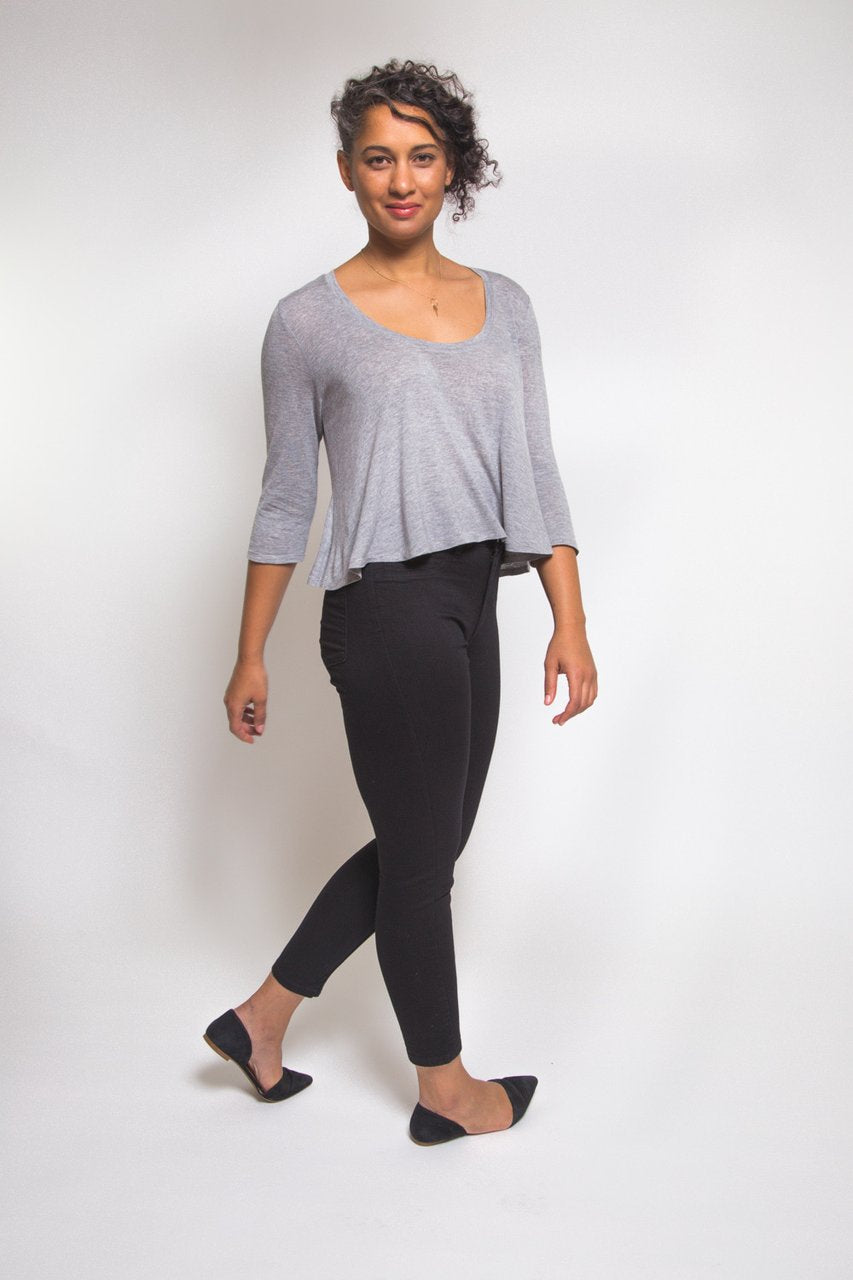 Make a fluid, drapey tee with light to medium-weight knits with at least 30% crosswise stretch, such as rayon, cotton, silk, merino & linen jerseys. A more sculptural Ebony can be made with sturdier fabrics like ponte and scuba knits.