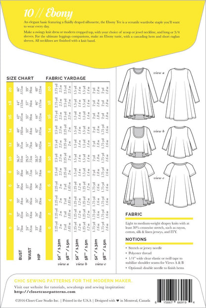 Make a swingy knit dress or modern cropped top, with your choice of scoop or jewel neckline, and long or 3/4 sleeves. For the ultimate leggings companions, make an Ebony tunic, with a cascading hem and short raglan sleeves. All necklines are finished with a knit band.