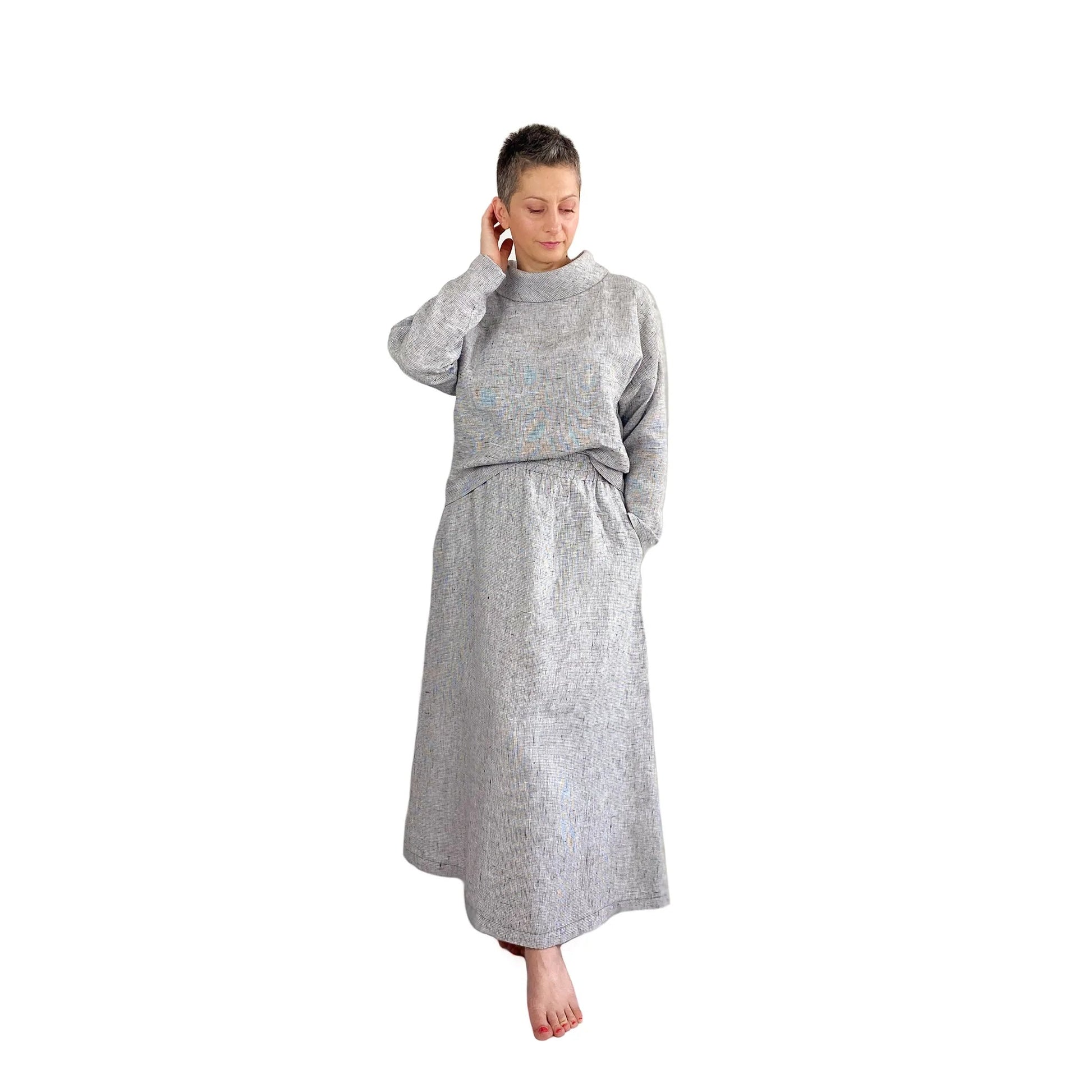Edith is an exciting pattern, offering the opportunity to use your imagination to create many new additions to your wardrobe. Although there is a wide range of options within the pattern, all of its elements should be within a keen beginner’s grasp. Edith features an elasticated waist for comfort, three neckline options, two skirt lengths, straight or curved hem, four different sleeves, as well as a skirt and top option.