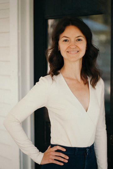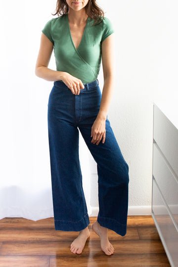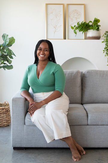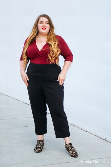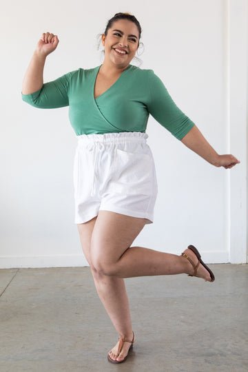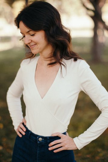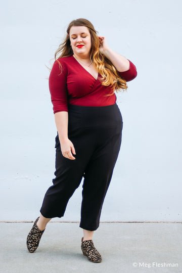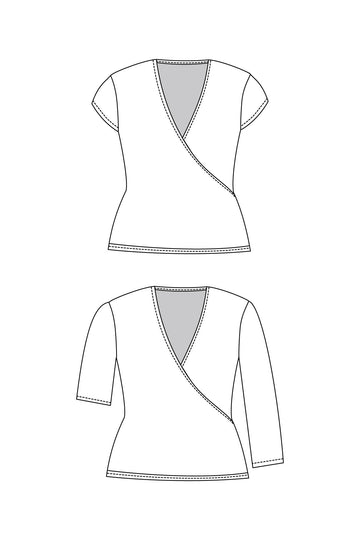 The Elio Top is a fitted knit top with a faux wrap silhouette. The neckline is finished with narrow elastic that allows the bodices to lay flush against the body. The hem is finished with optional fold over elastic so that it creates a smooth fit under high-waisted pants and skirts. Three sleeve lengths (cap, elbow, and long) make this design ideal for year-round wear.