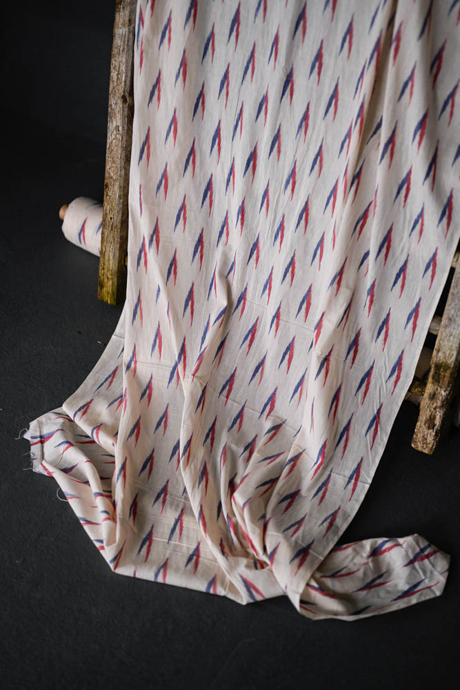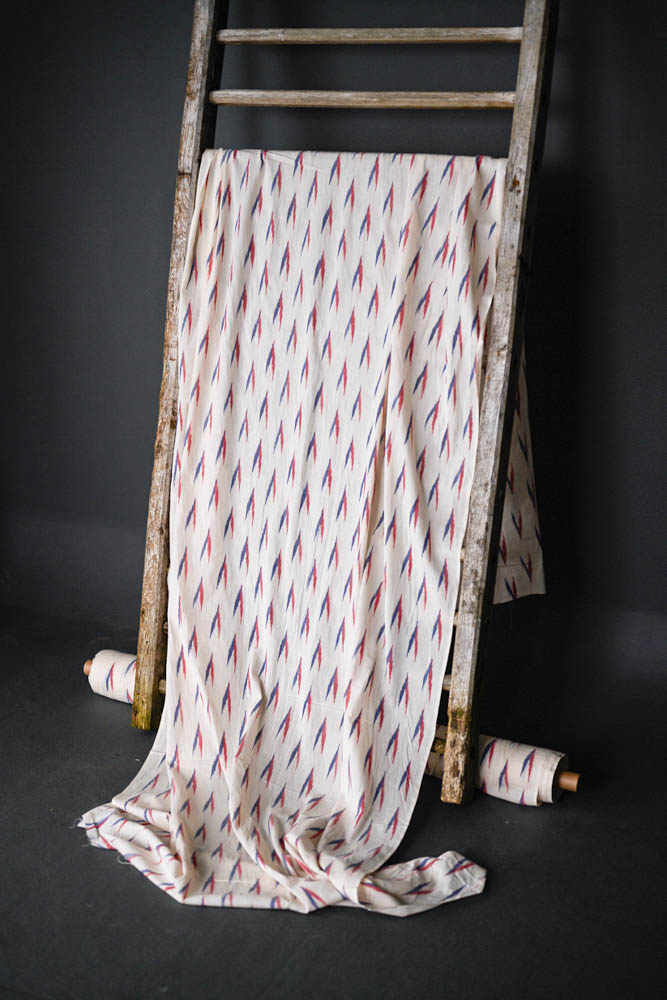 Ikat is a resist dyeing technique where the threads used for weaving are dyed beforehand. The Ikat threads are bound in a pattern so that the threads covered by the binding ‘resist’ the dye, creating a design. The more binding done before weaving, the more complicated the pattern. Ikat cloths are prone to slubs and often have ties in the cloth where one weaver ends and another begins, the ties will be on the wrong side of the cloth. These are not flaws.