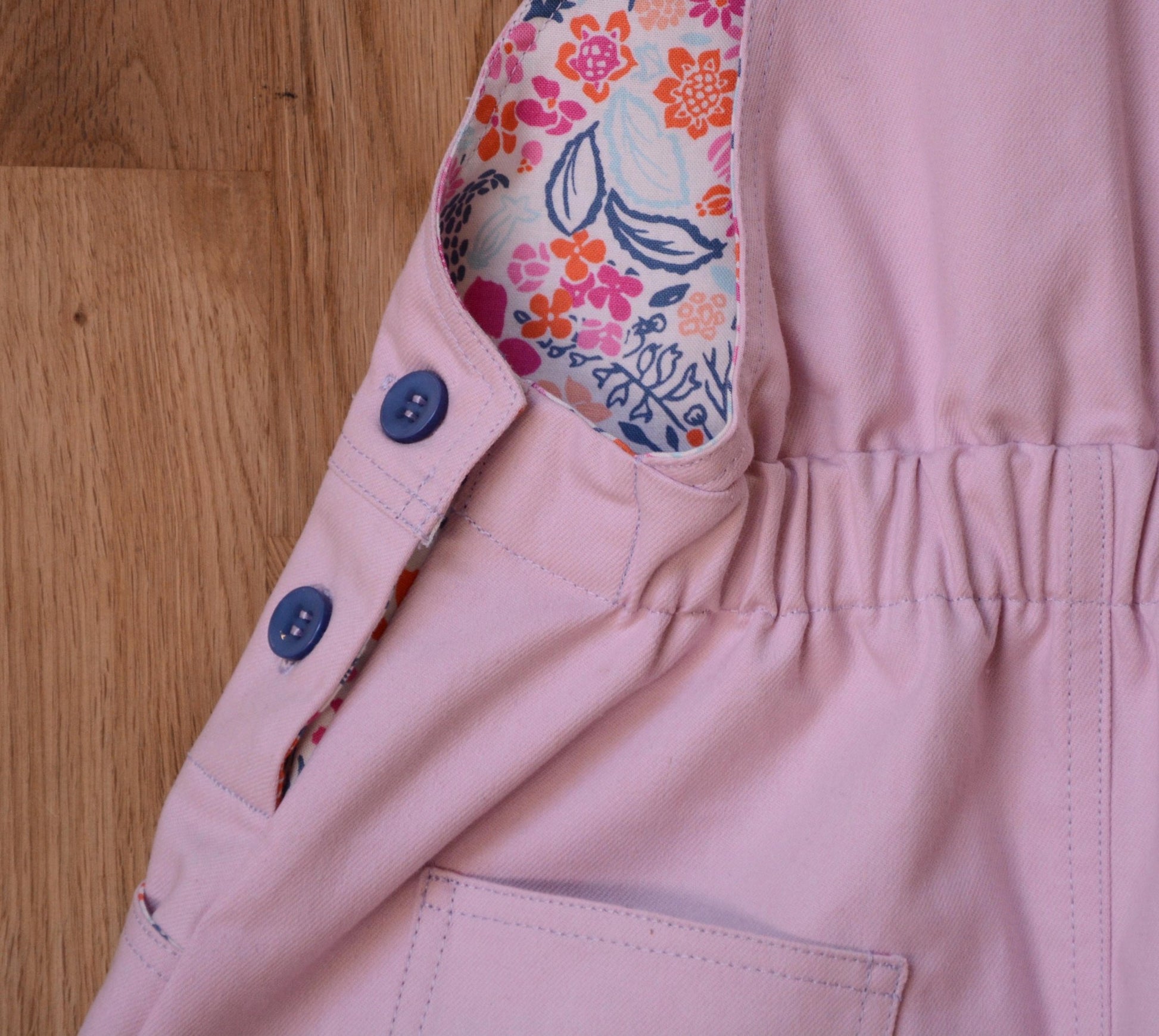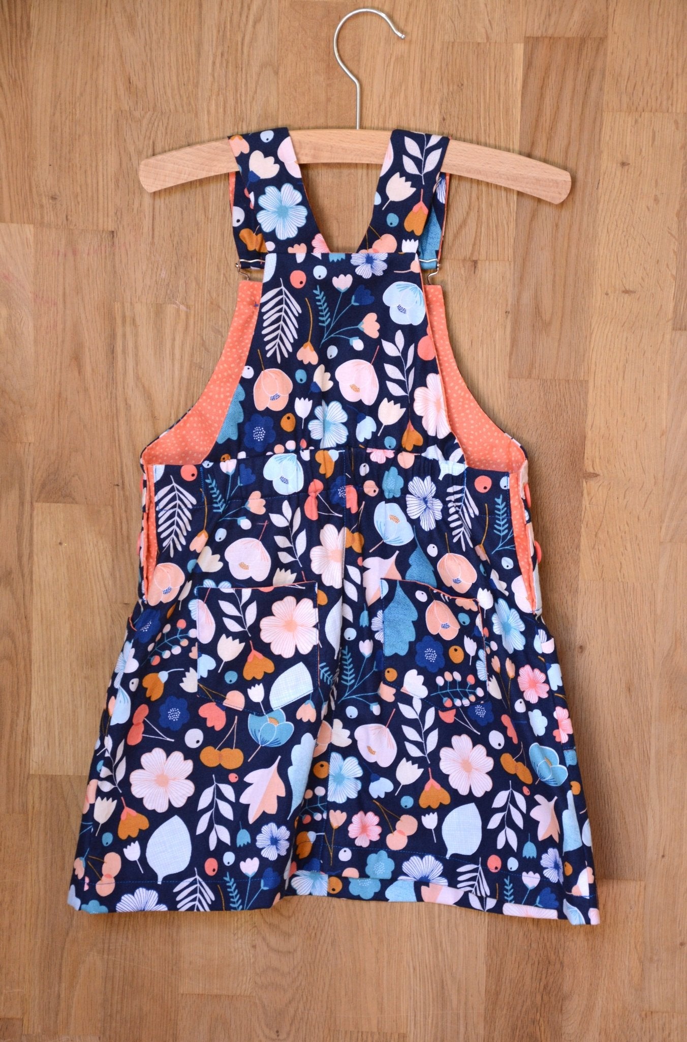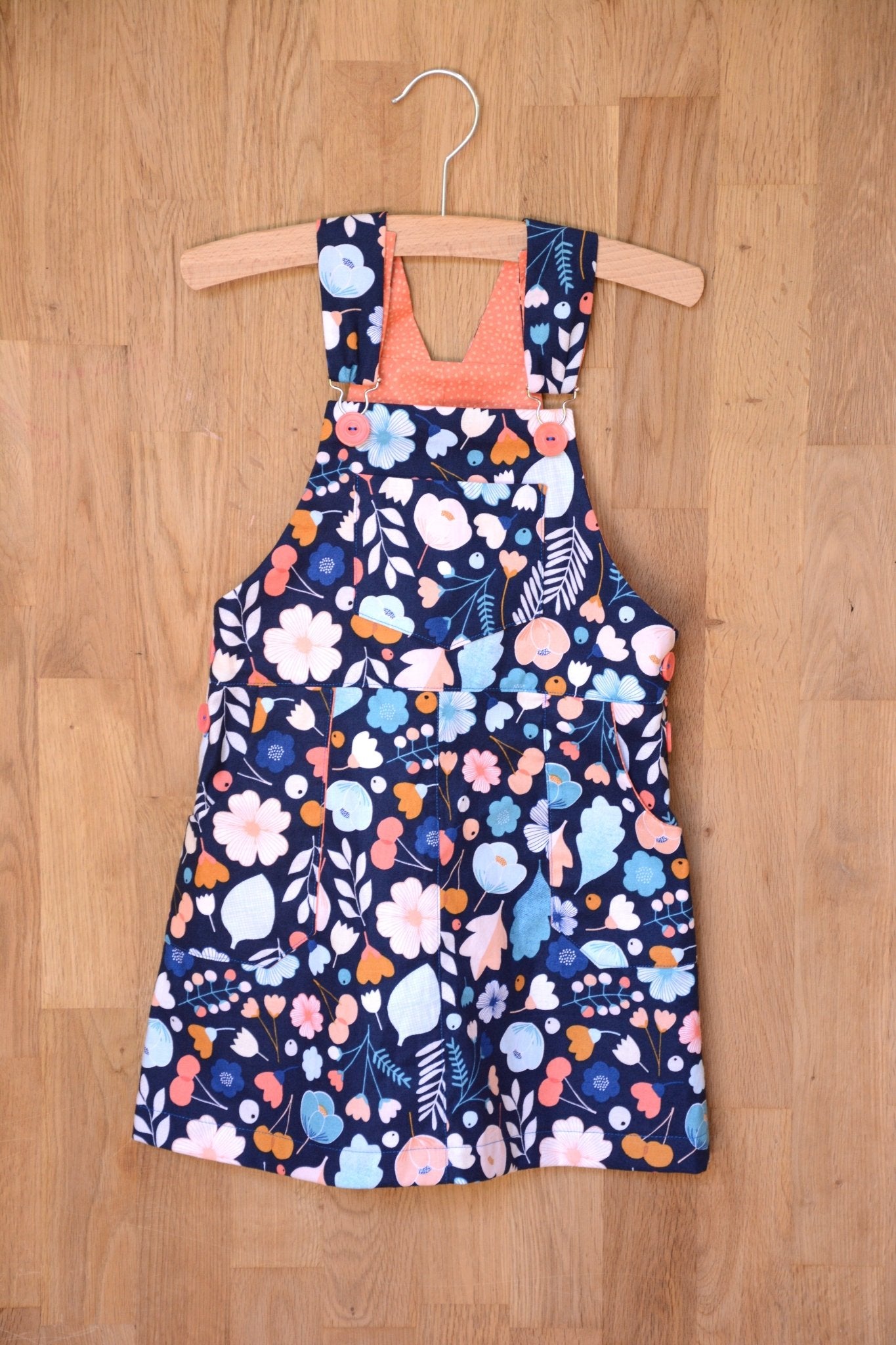 A unisex dungaree pattern for children. With contrast facing for straps, bibs, pockets and turn-ups. Keeping in mind practicality, the pattern features an elasticated back waist, and buttons on the side. A dress version is also included.