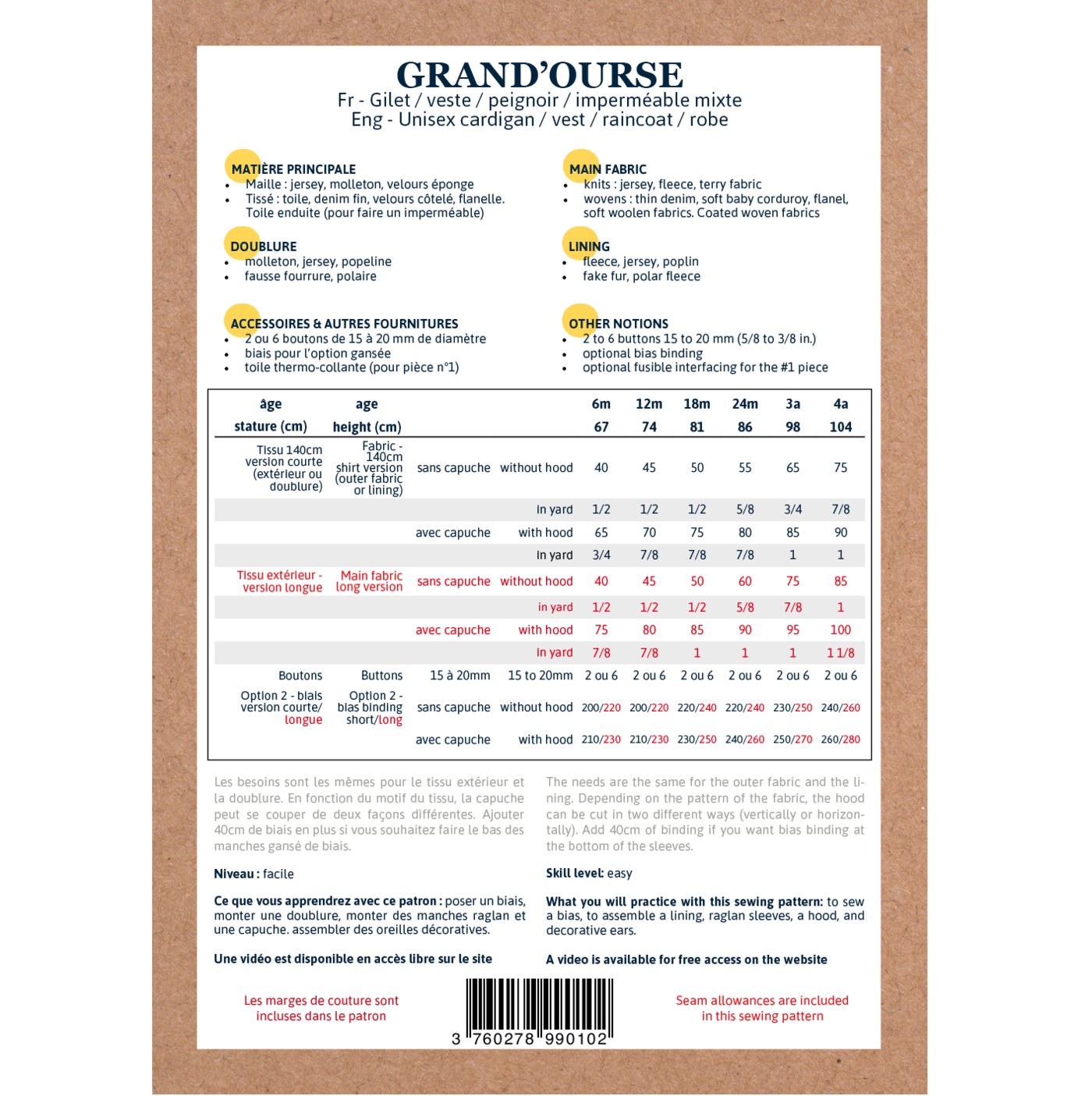 Grand'Ourse sewing pattern is also in kids, age range from 3 to 12 years old.