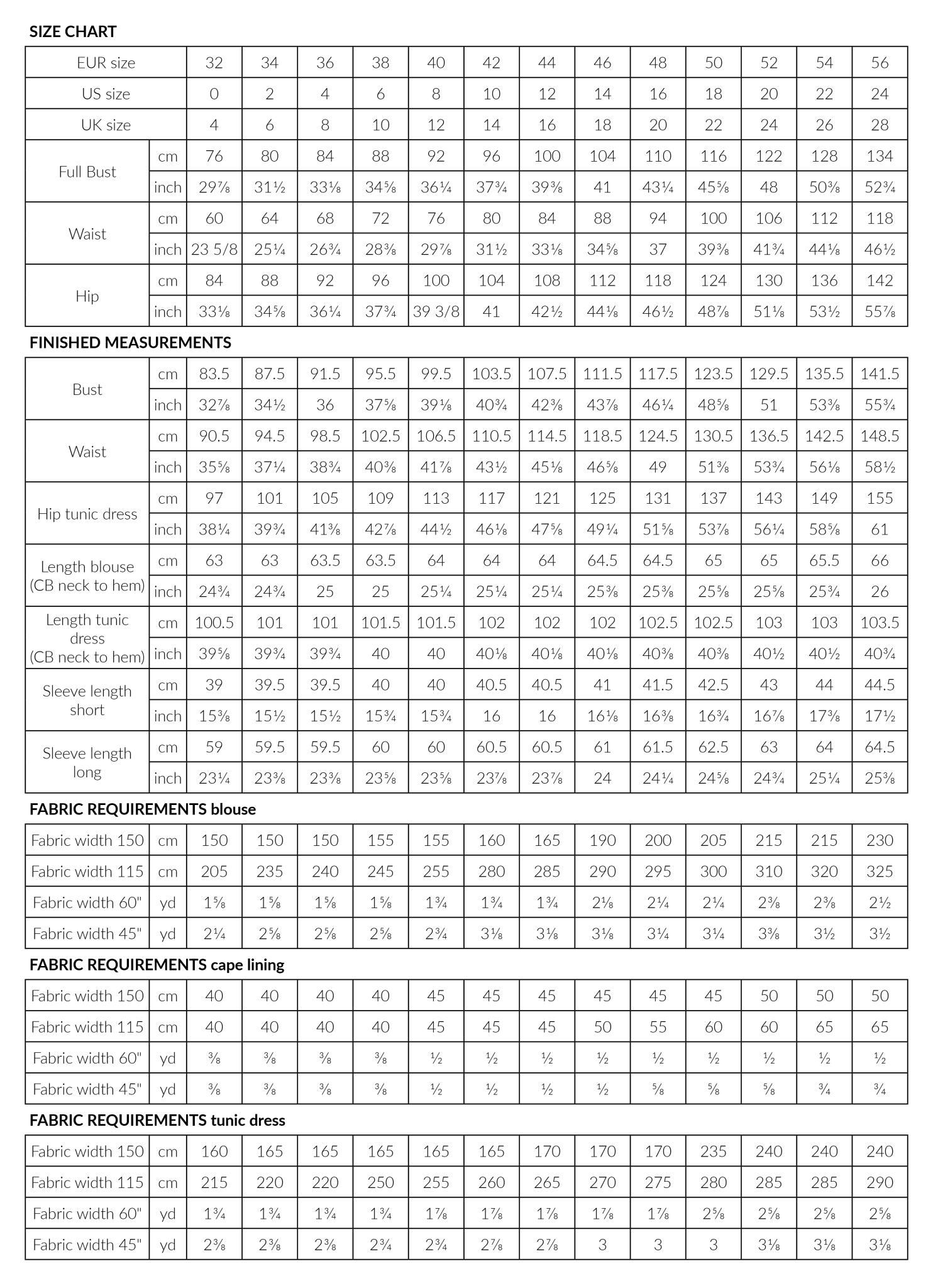The Helmi pattern includes two variations with details you can mix and match! The straight-cut blouse has elements from the classic trench coat, such as the cape and sleeve straps. The rounded collar and slightly curved hem with slits add a touch of soft femininity. The more streamlined tunic variation is also straight-cut and has a simple stand-up collar, half sleeves, and a curved hem. Both variations have a discreet and elegant hidden button placket.