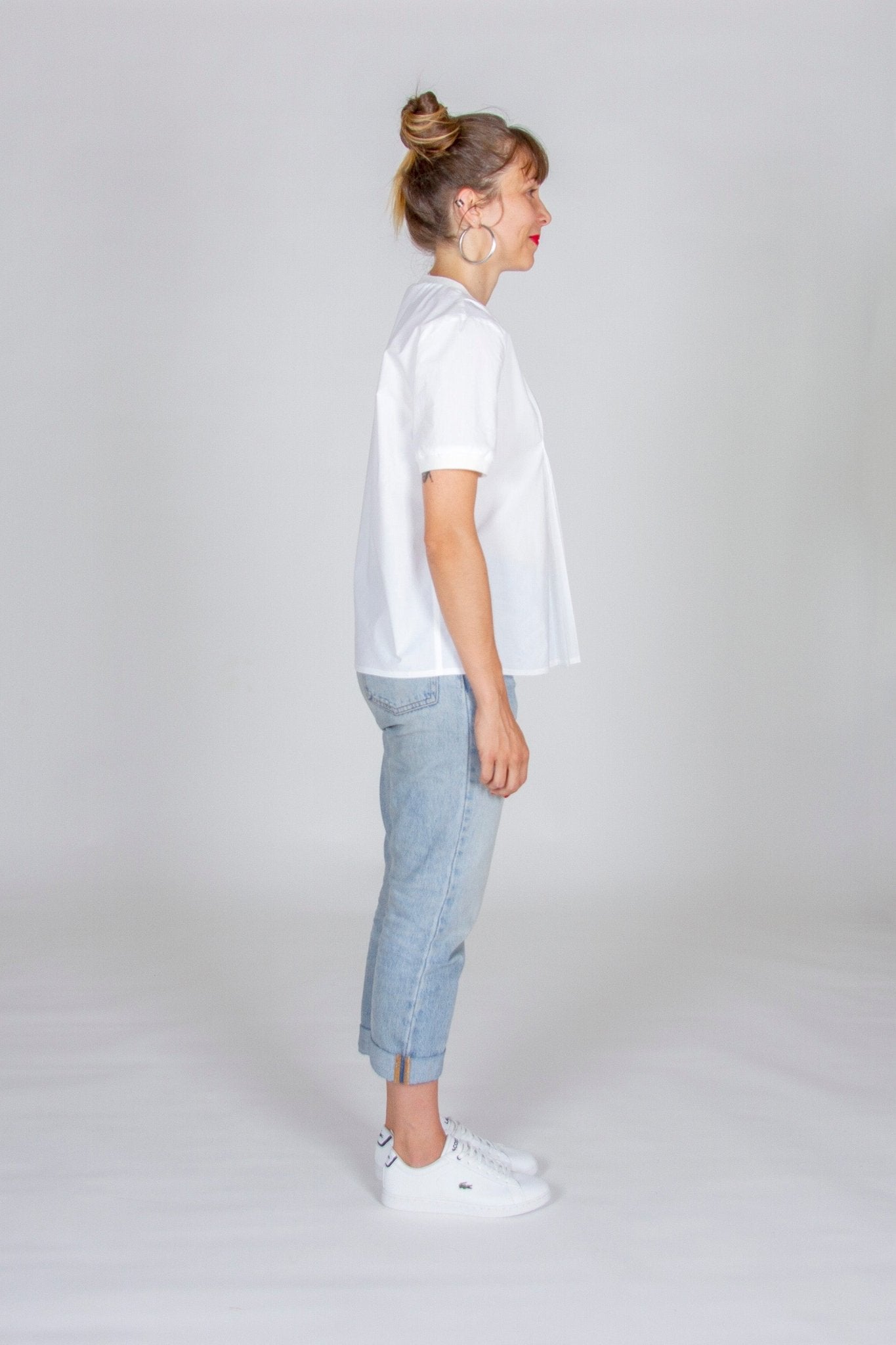 I am Clochette, a T-shirt shaped top made out of woven fabric and finished with ribbing. I have 4 pleats which start at the shoulder,  are maintained at the bust and then left loose all the way down to the bottom. I can be made in short of long sleeves. My neckline and my cuffs are finished with ribbing.