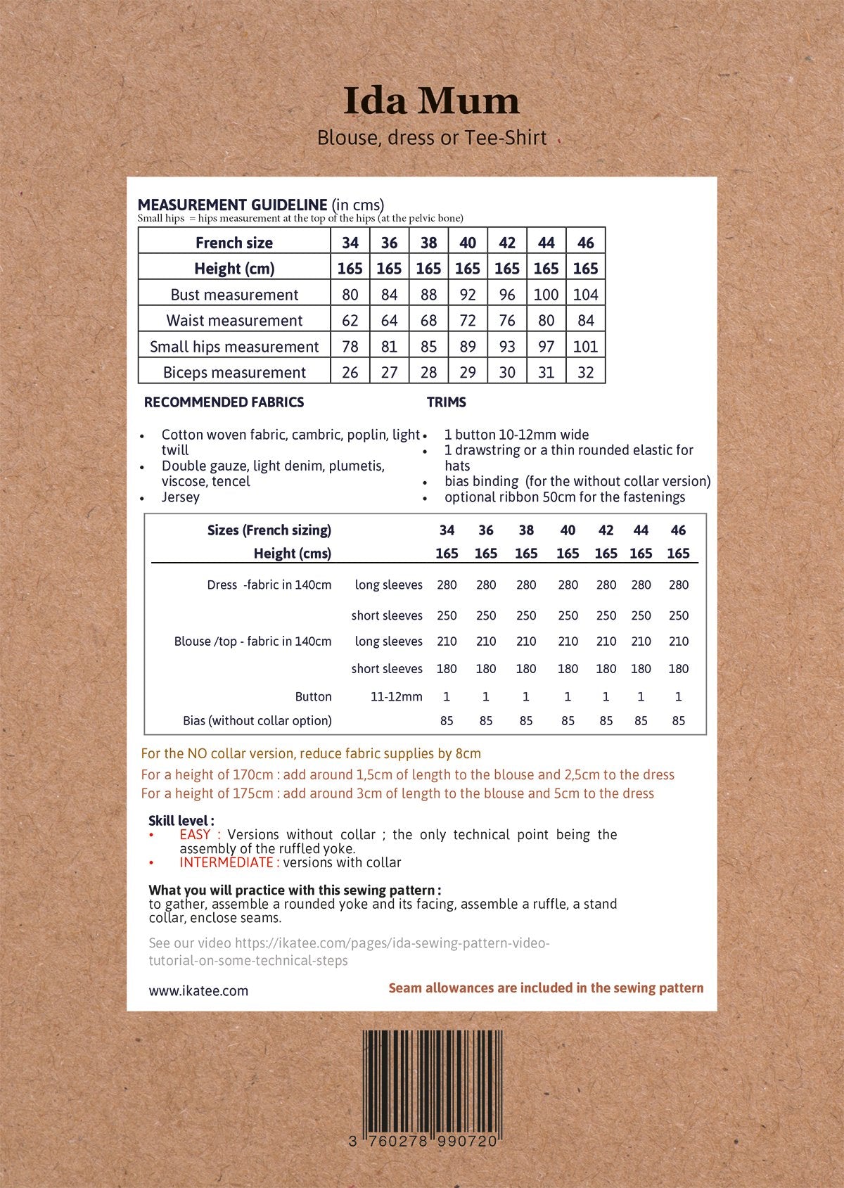 The sewing pattern is proposed in French sizes 34, 36, 38, 40, 42, 44, 46 which corresponds to specific measurements. Please see standard measurement guideline (in cms). Standard heigth is 165cms.