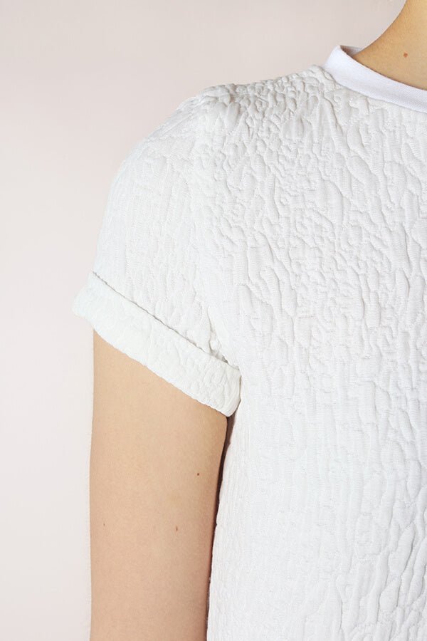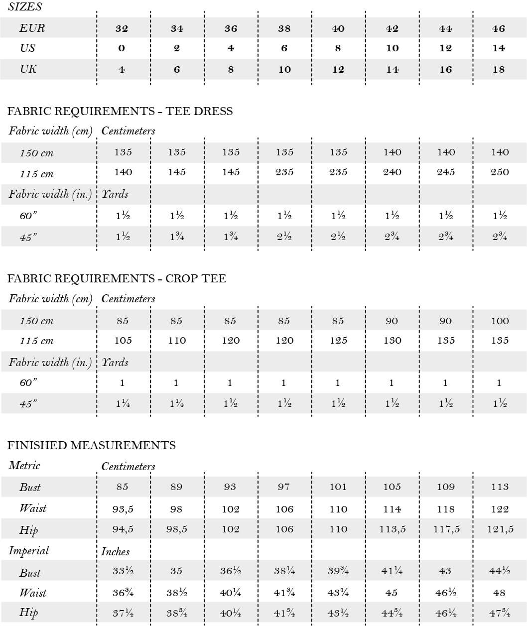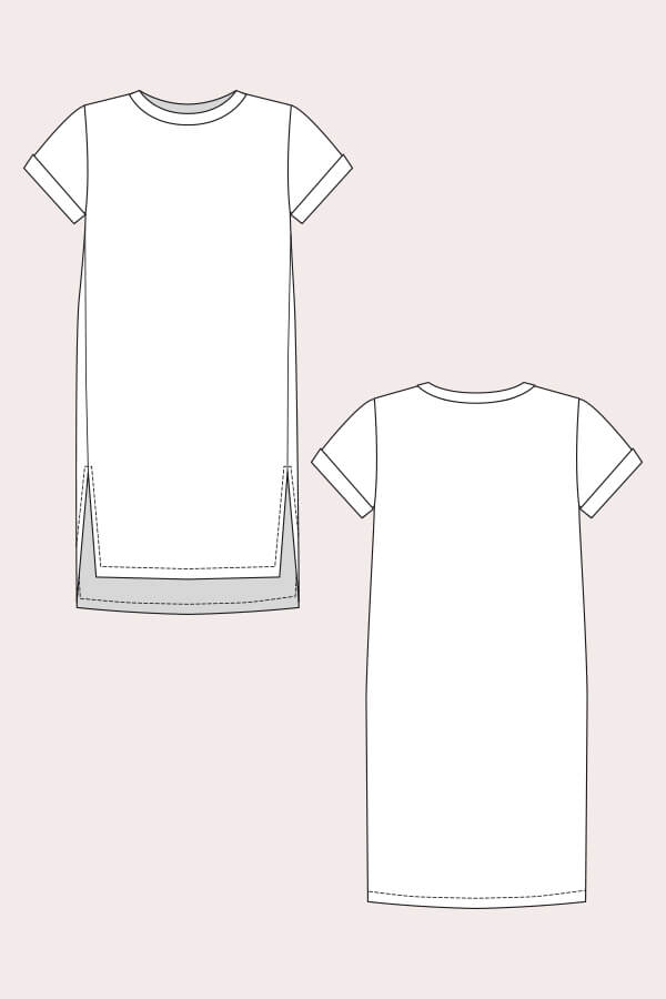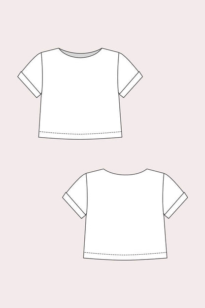 • The pattern includes two variations: A loose-fitting tee dress and a cropped A-line tee