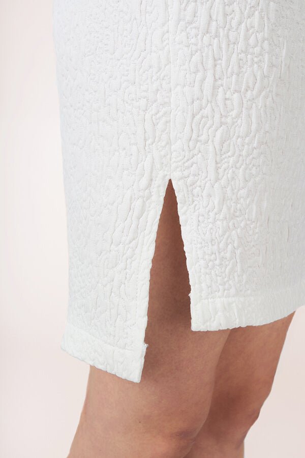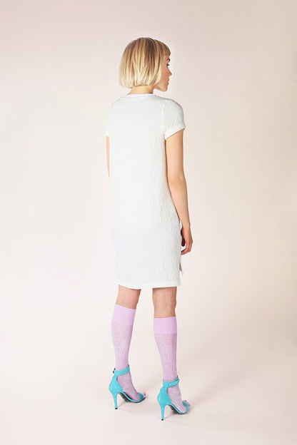 • The dress is slightly cocoon-shaped, with an uneven hemline