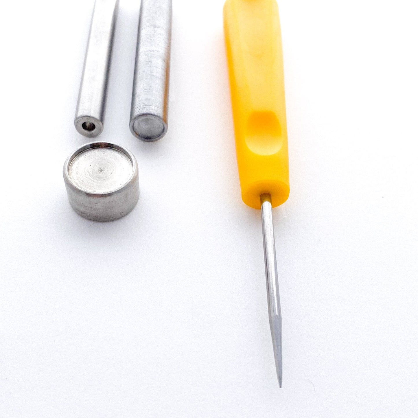 1 x reusable tool kit - including 3mm thick awl, circular anvil, rivet setter and button setter. You will also need your own hammer to use this kit.