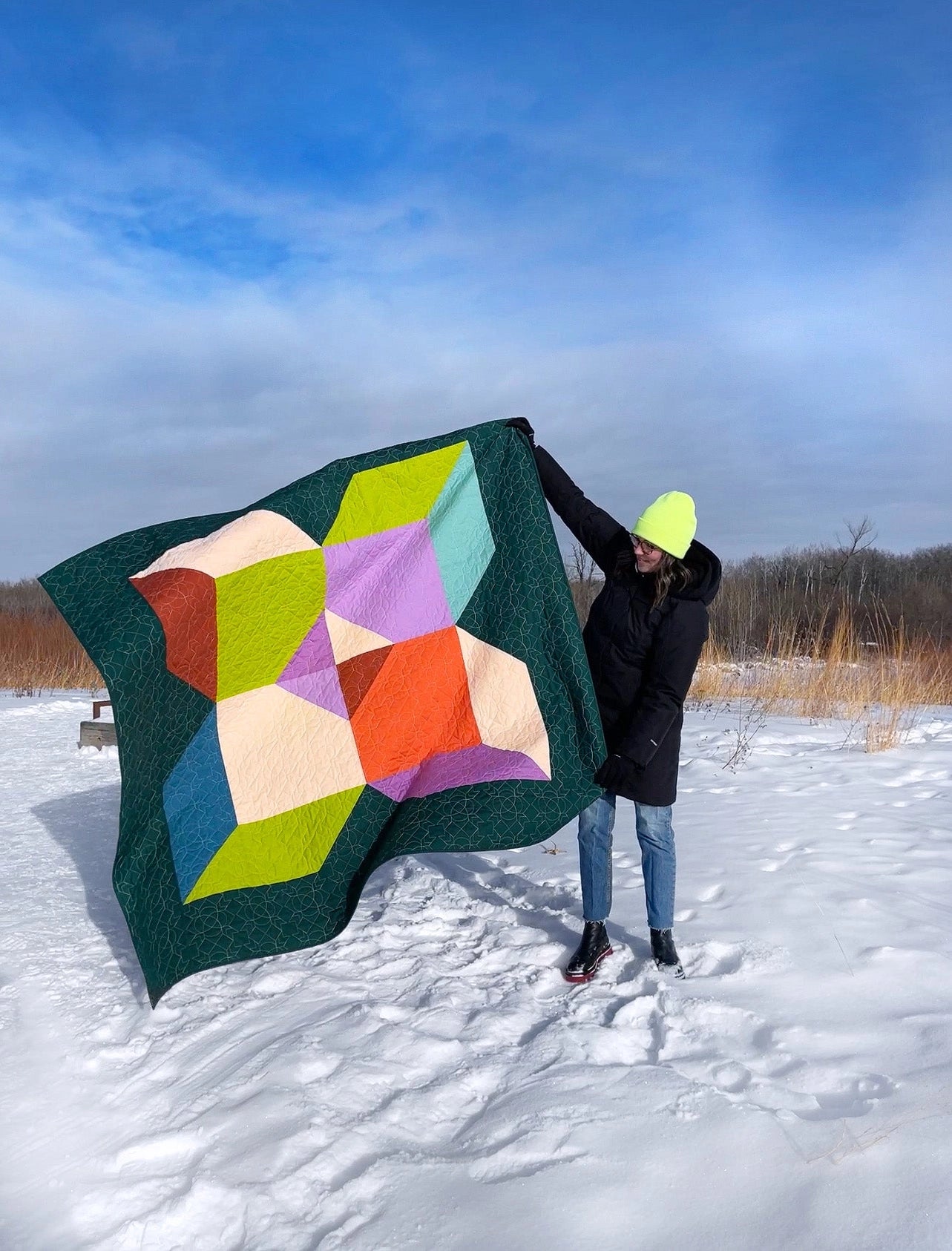 This modern, original quilt pattern is perfect for confident beginners! Includes a two-colour, five-colour and multi-colour option. The pattern includes instructions for the following sizes: