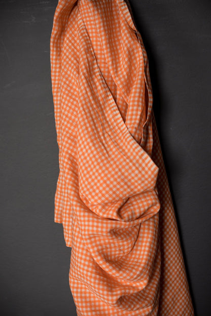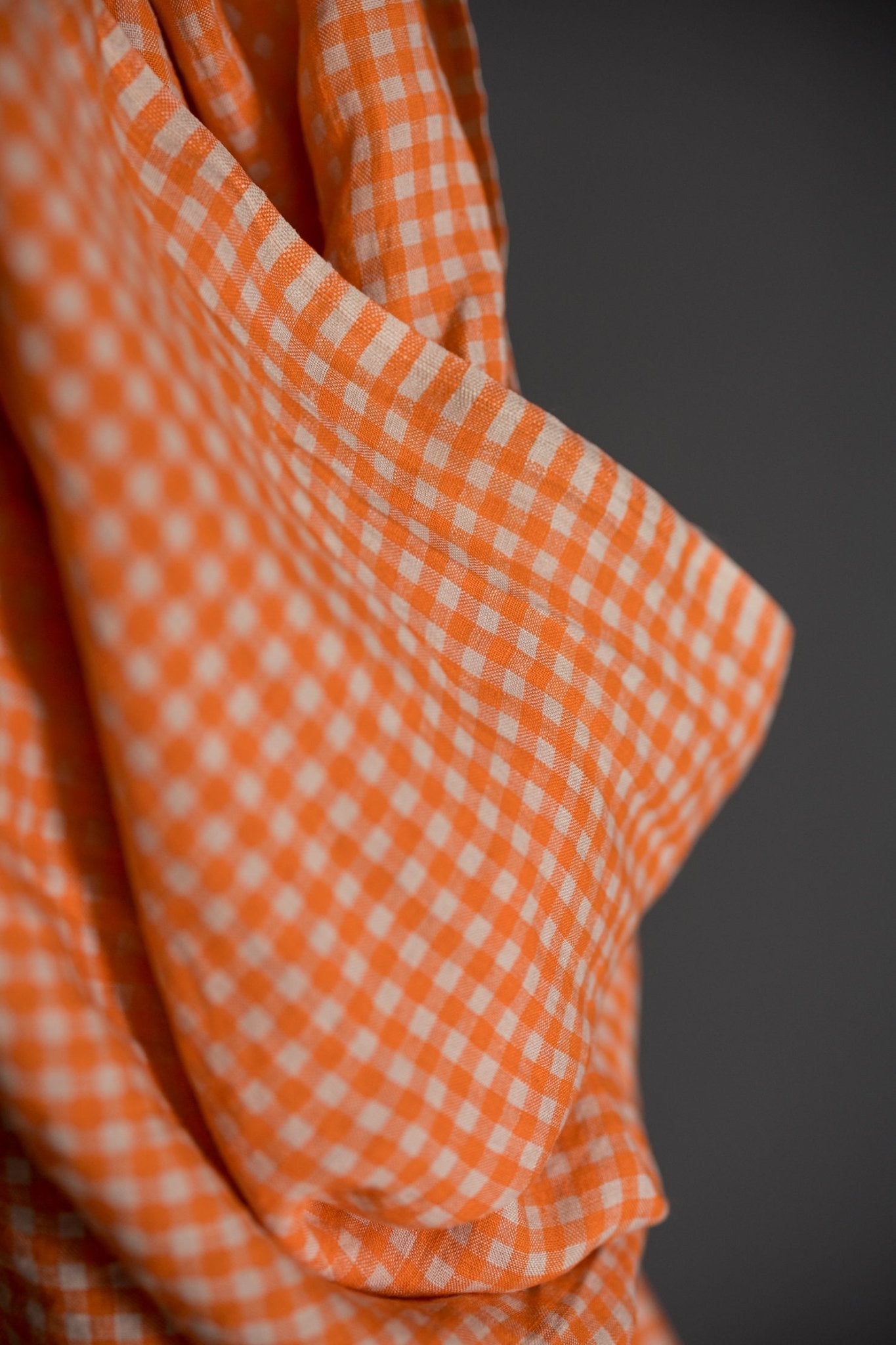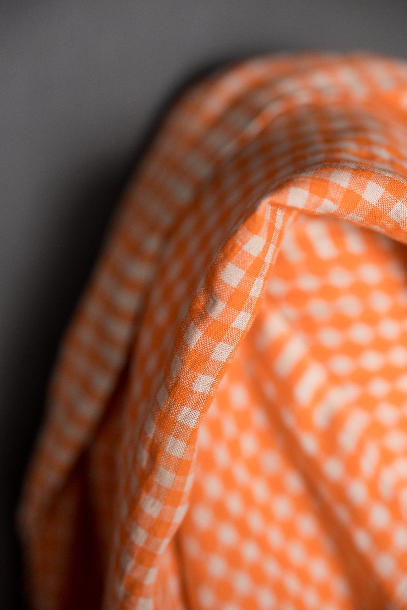 This linen is produced in small batches in Eastern Europe where there is a strong heritage of spinning and weaving linen fabric. A gingham of natural and vivid orange.