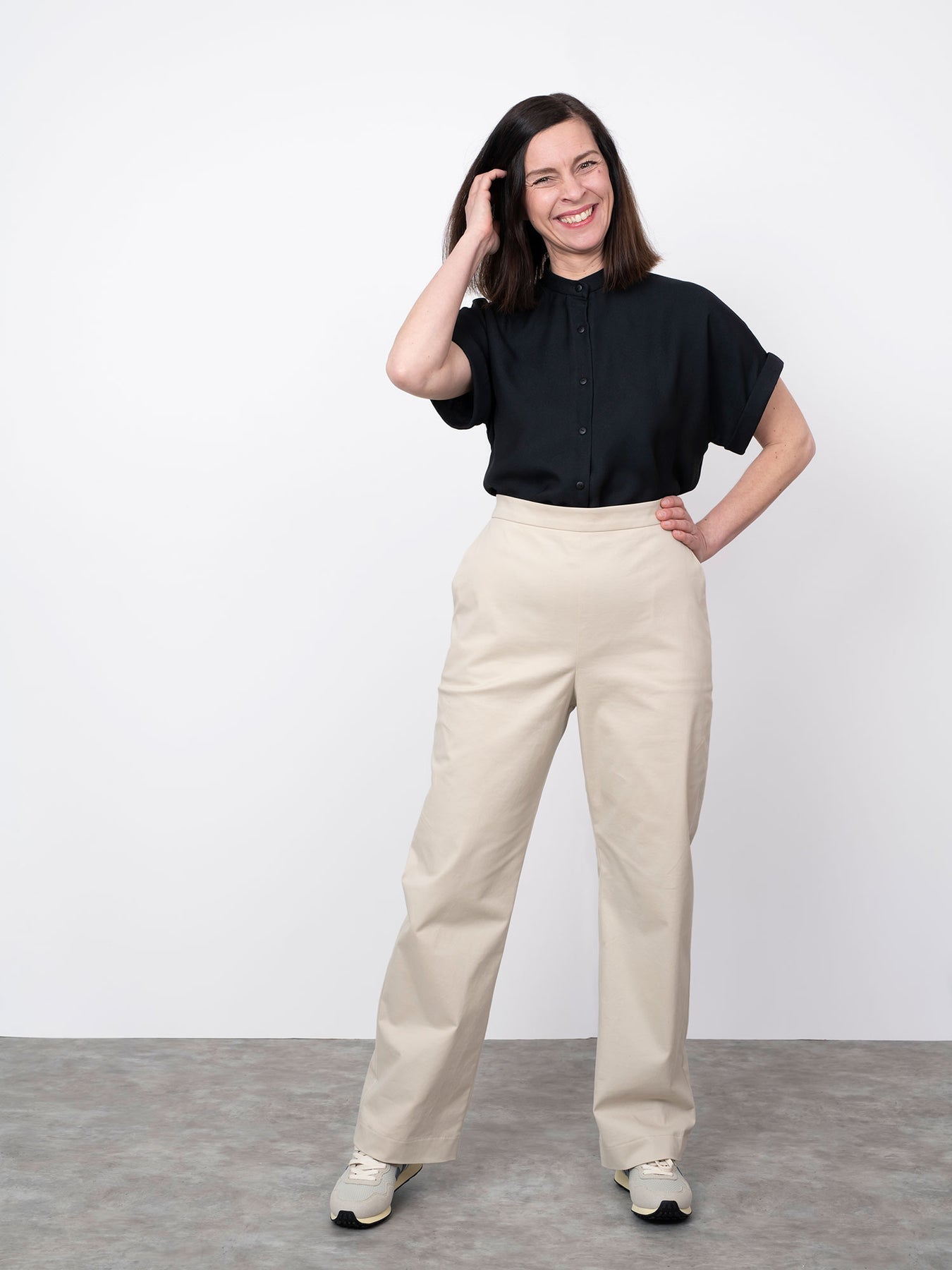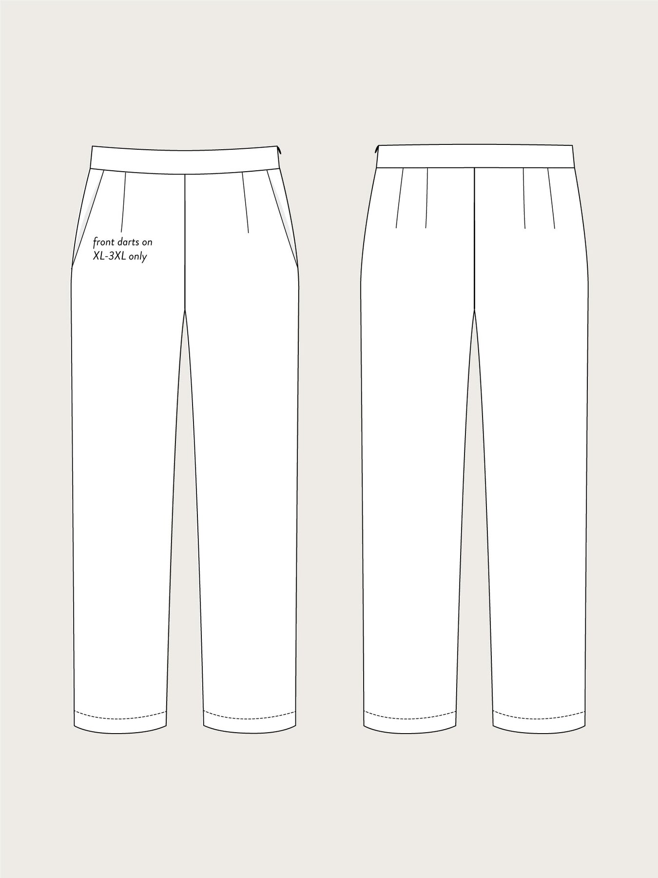 This basic pattern is our most adjustable pattern. In the assembly instructions, we guide you on how to raise or lower the rise, change the waist width, adjust the allowance mid front and alter the length. All depending on your own preference.