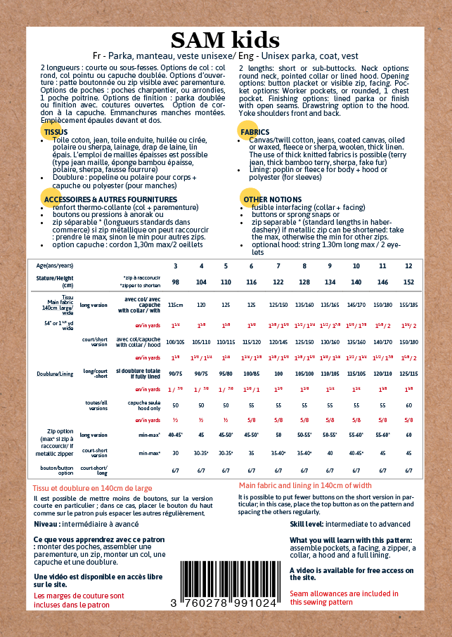 What you will learn with this pattern: how to assemble pockets, assemble a facing, a zipper, a collar or a hood and a lining.