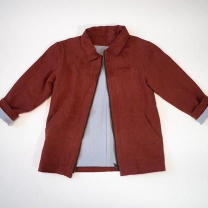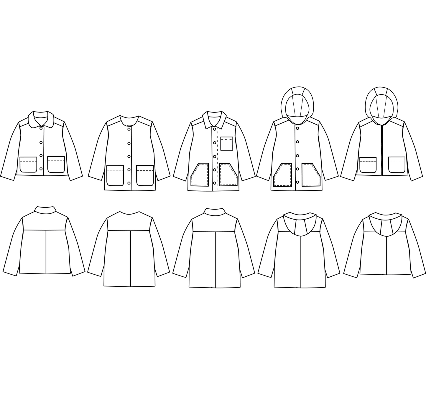 Sewing pattern for a unisex parka, jacket, coat or vest. 2 lengths: short or under-buttocks. Collar options: round neck, round collar, classic collar or lined hood. Opening options: button placket or visible zipper with facing. Pocket options: worker or round pockets, 1 chest pocket. Finishing options: lined parka or finish with open seams. Drawstring hood option. Front and back shoulder yoke.