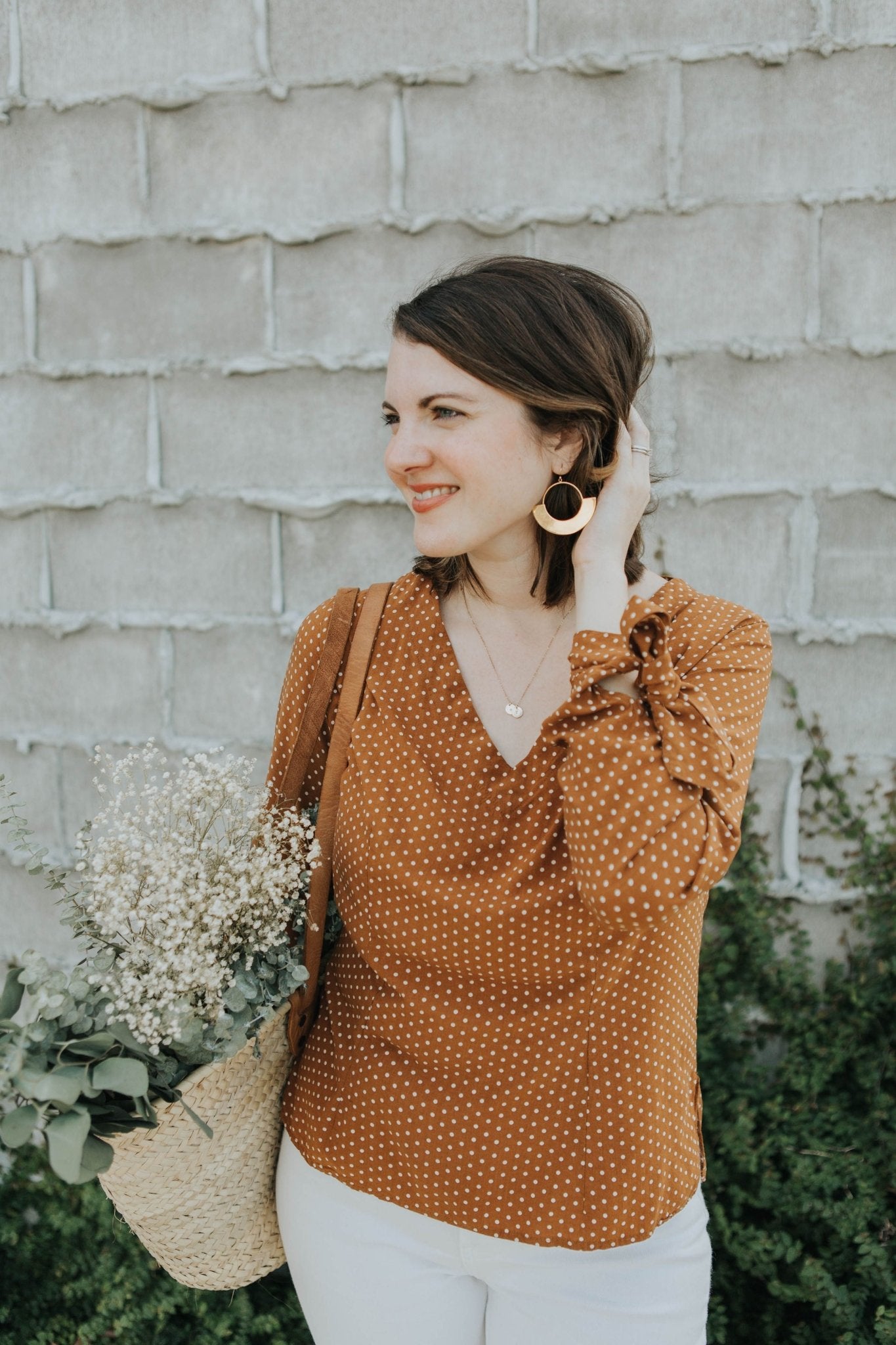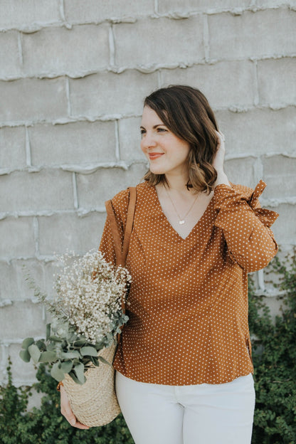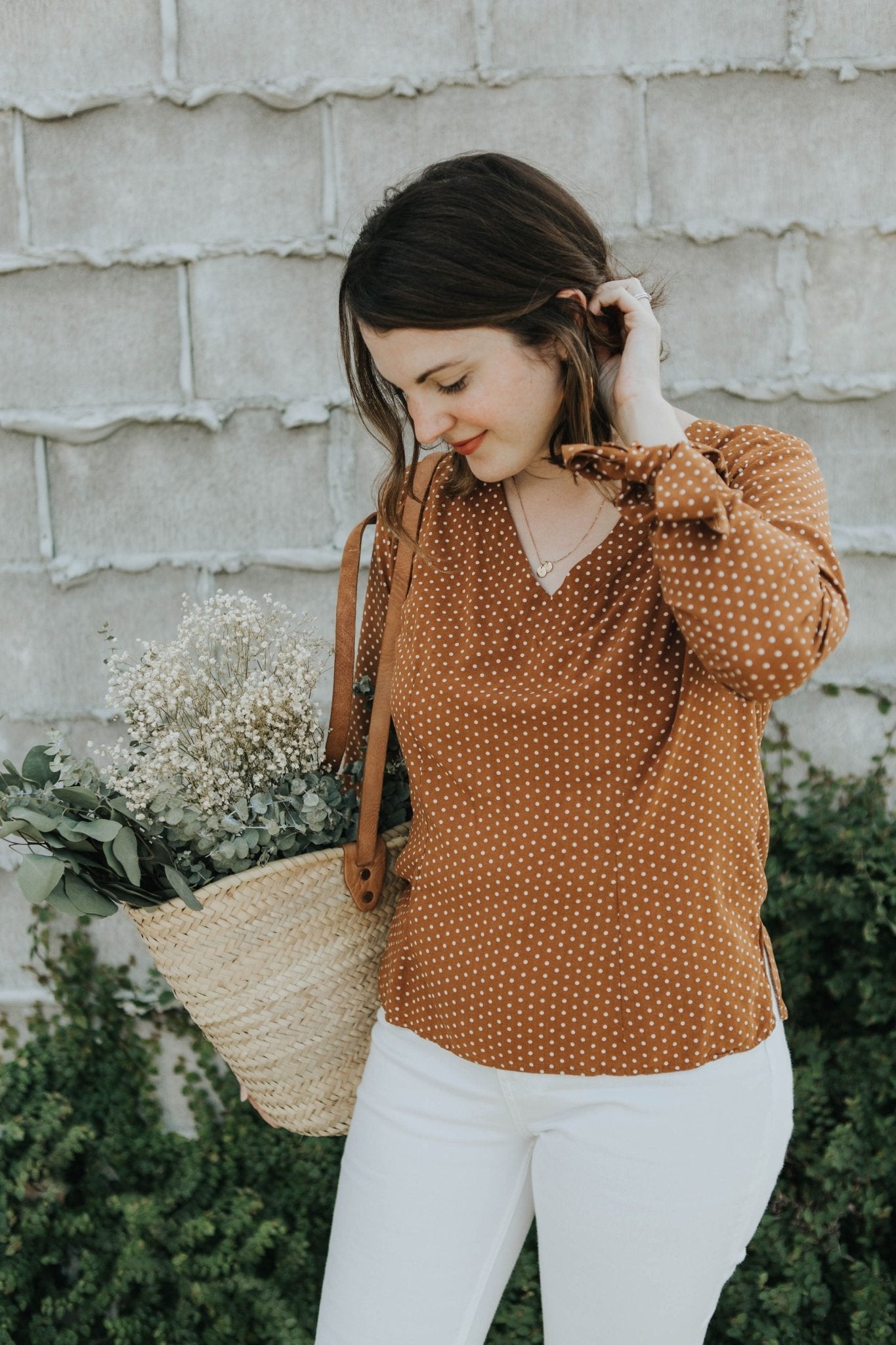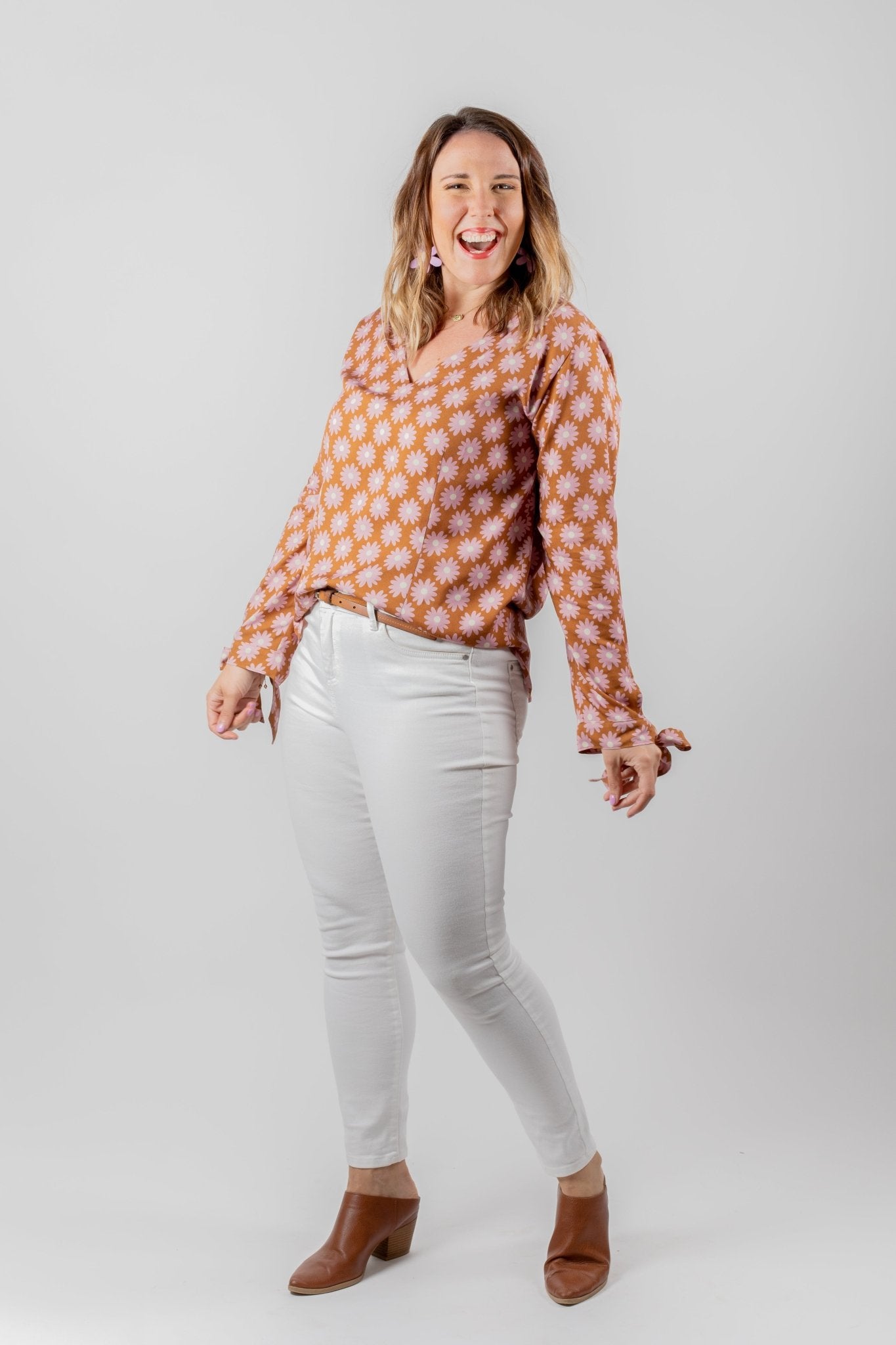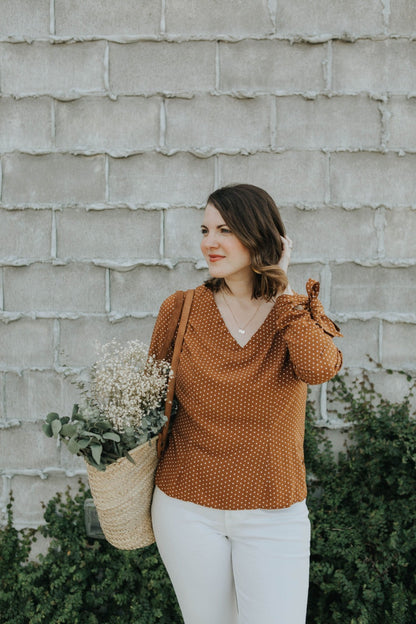 The feminine details and soft silhouette of the Seoul Blossom Blouse are inspired by my time discovering the wonders and beauty of South Korea. This top features flattering front diamond darts, V-Neck, and a curved back hem with side slits making it perfect for the "french tuck". The optional bow cuff completes the design making this the top you've been looking for to add to your handmade wardrobe.