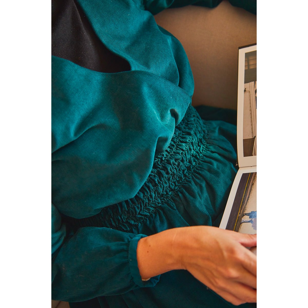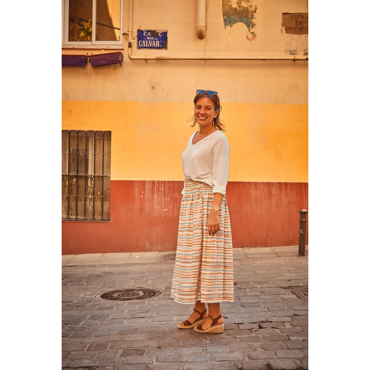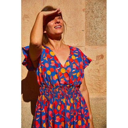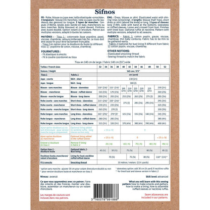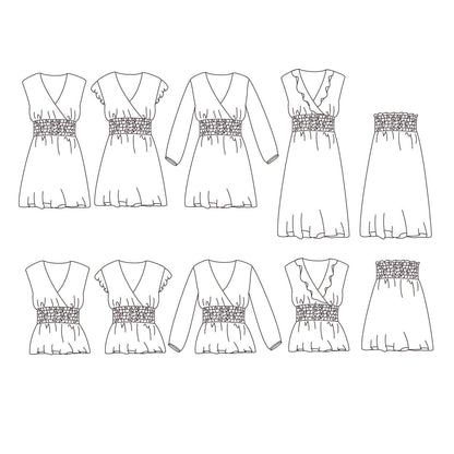Dress, blouse or skirt with smocked elasticated waist. 3 lengths: blouse (half hips), short (above the knee) or long dress or skirt. 3 types of sleeves: long (7/8th, wide with band at bottom), ruffled sleeve or sleeveless. Loose ant and crossed front bust Finishes with lined bust. Optional flounce at the neckline. Pattern with multiple versions, adapted to all seasons