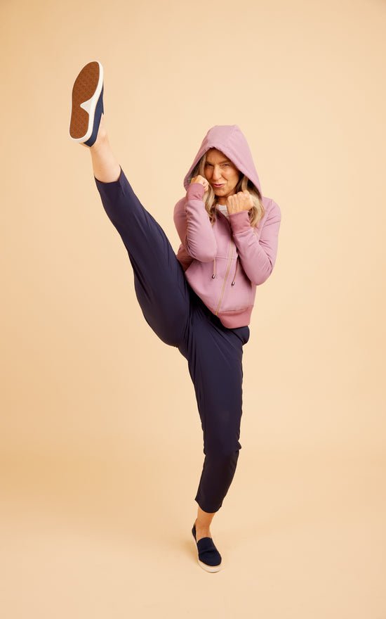 The Stanton features a pullover and a zip-up version, and both have a curved yoke at the shoulder with the great fit of a set-in sleeve. The roomy pockets let you leave your purse at home and run free. Get playful with color-blocking or go monochrome for a chic look. From the yoga studio, to the coffee shop, you'll be looking sharp!