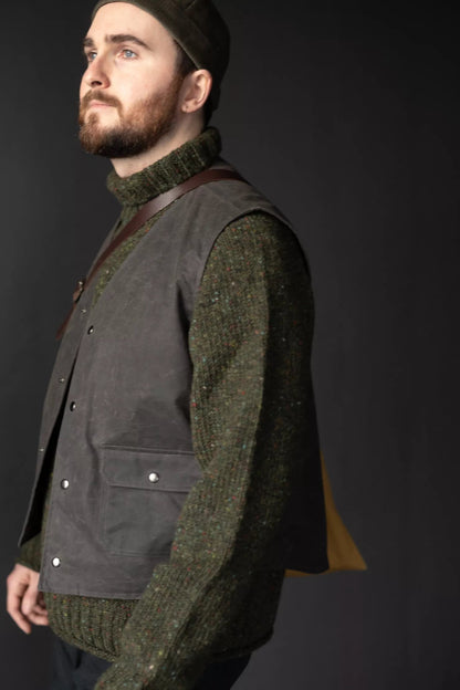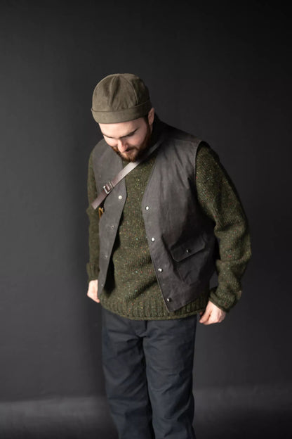 Dave is wearing the Billy in Chocolate Organic Cotton Oilskin layered up with The Arbor.