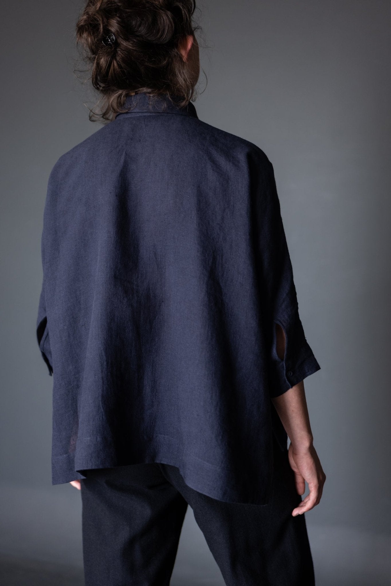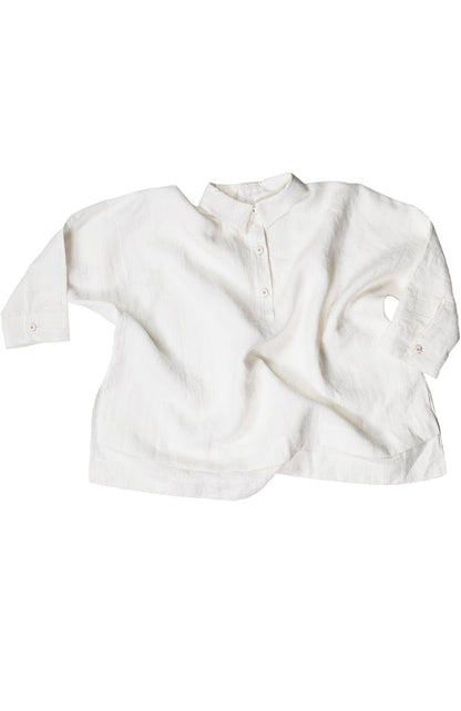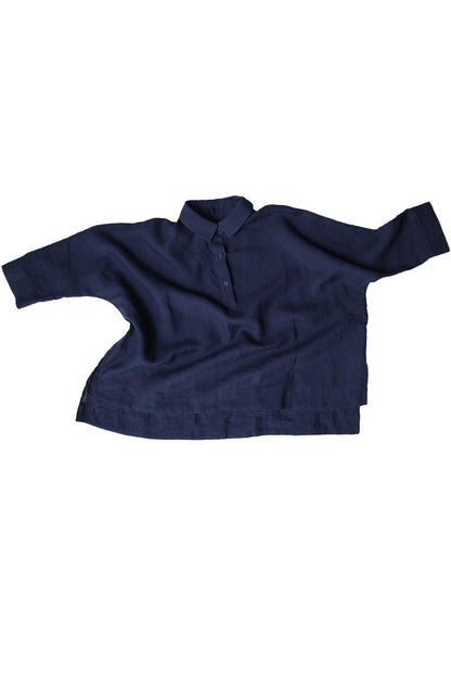 An oversized, boxy shirt with a dropped back hem and half placket. Swingy and absurdly comfortable.