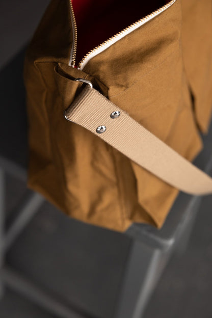 Tan bag – Olive Dry Oilskin, with 50z Orange as the lining, tan 30mm webbing.